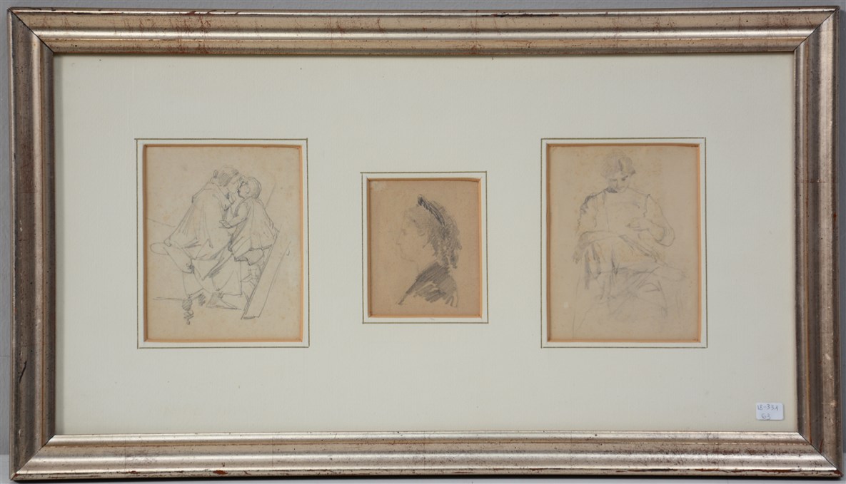 Ignoto, "Figure" tre disegni a matita su carta, al retro cartiglio della Galler