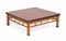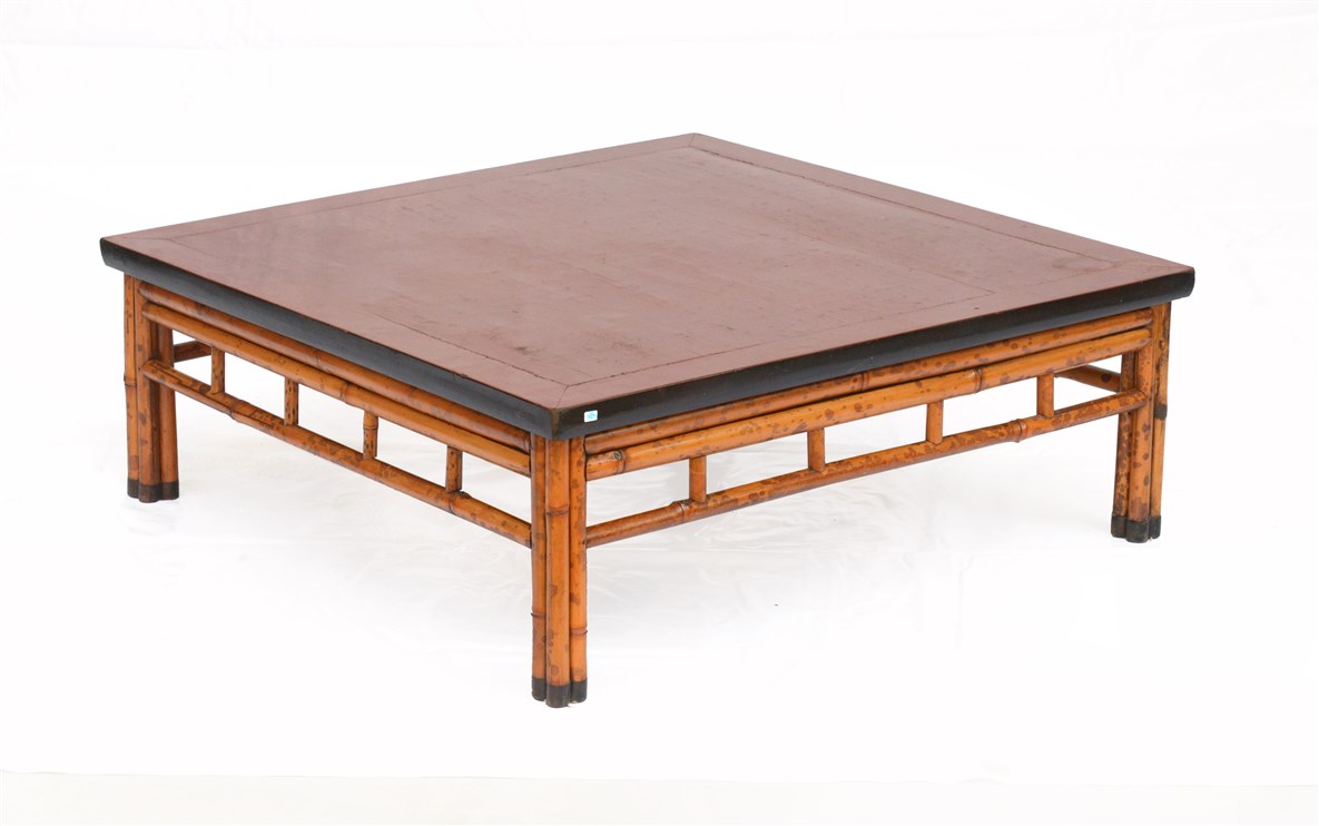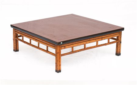 Tavolino da salotto con piano in lacca rossa, gambe e traverse in bamboo (cm 94x34x94) (difetti e mancanze)
