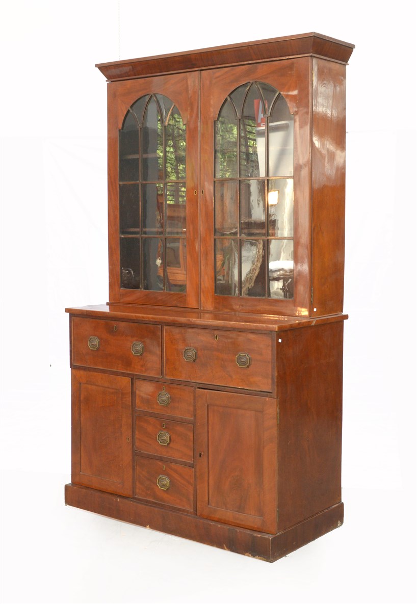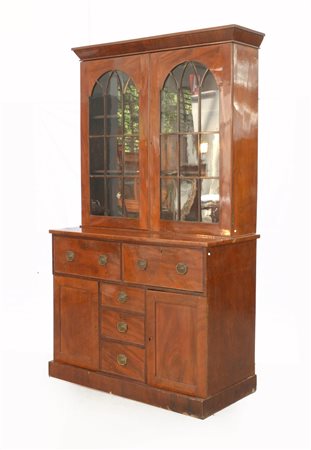 Libreria a due corpi lastronata in mogano. Parte superiore a due ante a vetri, parte inferiore a cinque cassetti in linea e due sportelli, Inghilterra secolo XIX (cm 112x207x57) (difetti)
