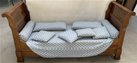 Letto a barca con montanti filettati in legno chiaro. Secolo XIX (largh. cm 220) (difetti e restauri)