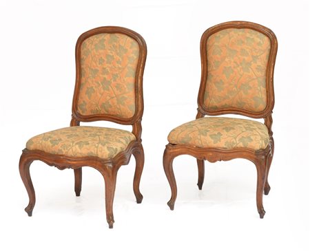Coppia di sedie in noce con fascia e gambe sagomate, seduta e schienale con tes