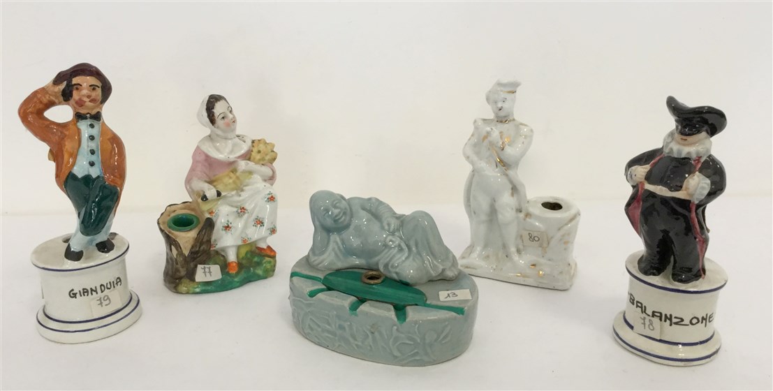 Gruppo di cinque calamai con figure in ceramica dipinta, fatture ed epoche differenti (difetti e mancanze)