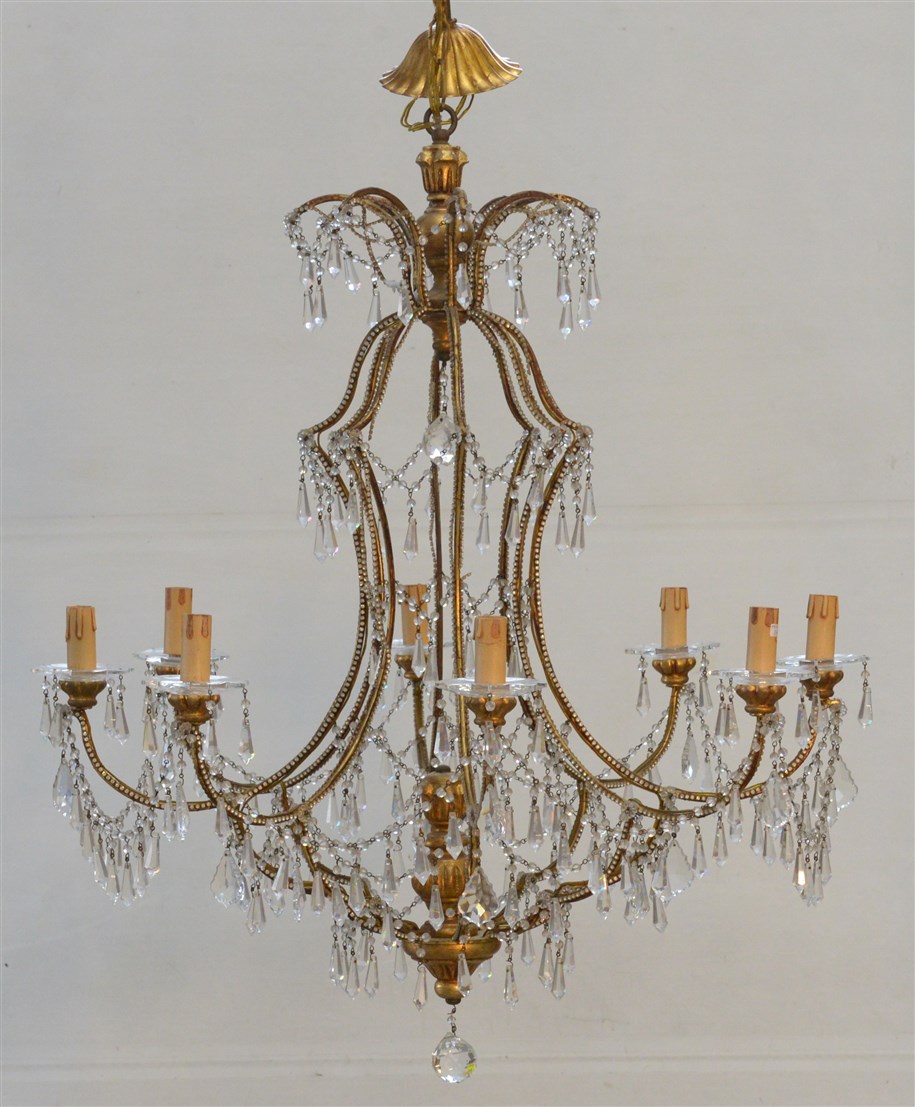 Lampadario a otto luci con struttura in ferro e legno dorato decorato con perline e pendagli in cristallo (h cm 95 circa, d cm 67) (lievi difetti e mancanze)