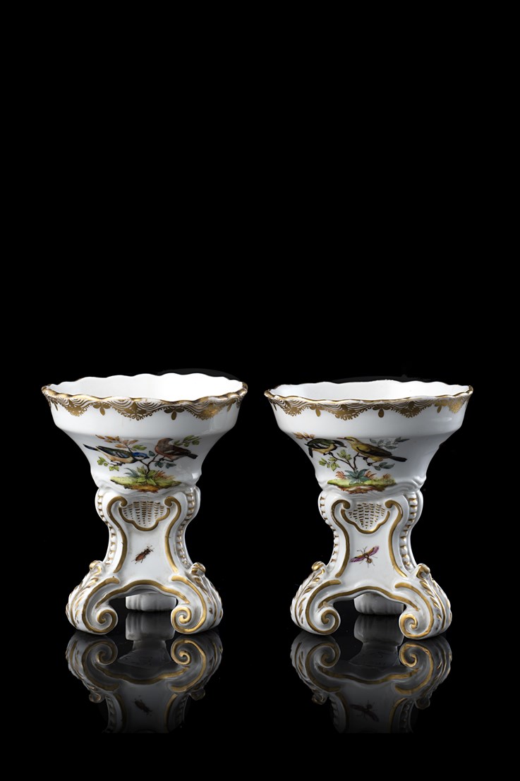 Manifattura tedesca, fine secolo XIX. Coppia di alzate in porcellana bianca decorata in policromia con volatili, farfalle ed insetti, bordo mistilineo bordato in oro, base tripode e marca di fabbrica alla base (h. cm 10) (difetti)