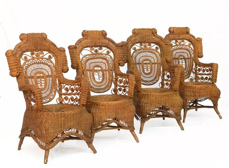 Gruppo di quattro poltroncine in vimini finemente intrecciato, secolo XX (difet