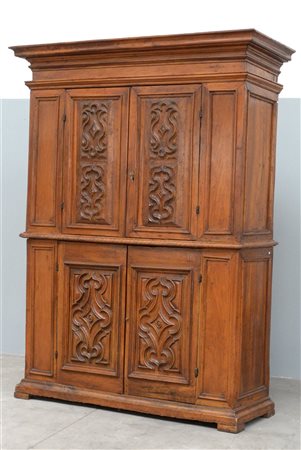 Antica grande credenza a due corpi in noce con quattro ante pannelate e scolpite, montanti e fianchi riquadrati da sagomette in rilievo.(cm 170x224x60) (difetti)
