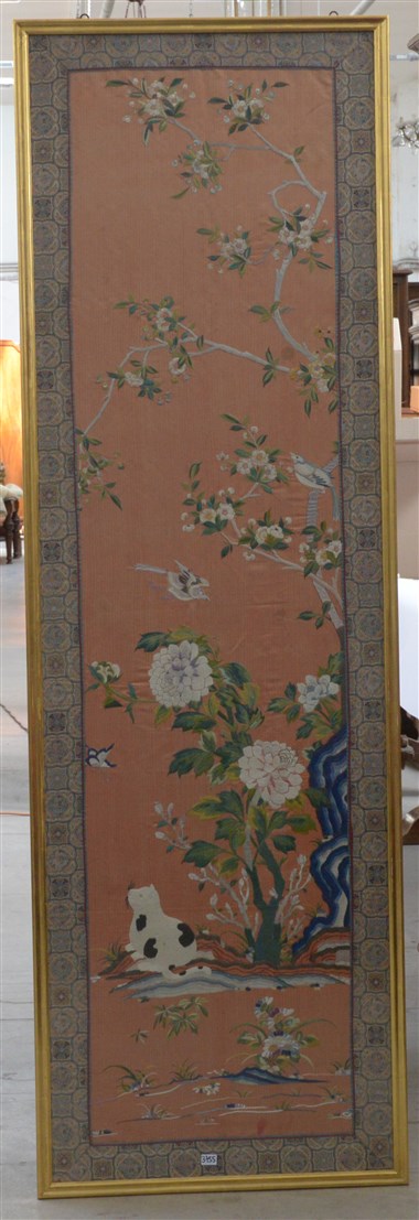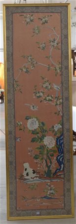 Ricamo in seta policroma su fondo di raso di seta color salmone, raffigurante rami fioriti e animali in policromica. Cina, fine secolo XIX. In cornice