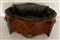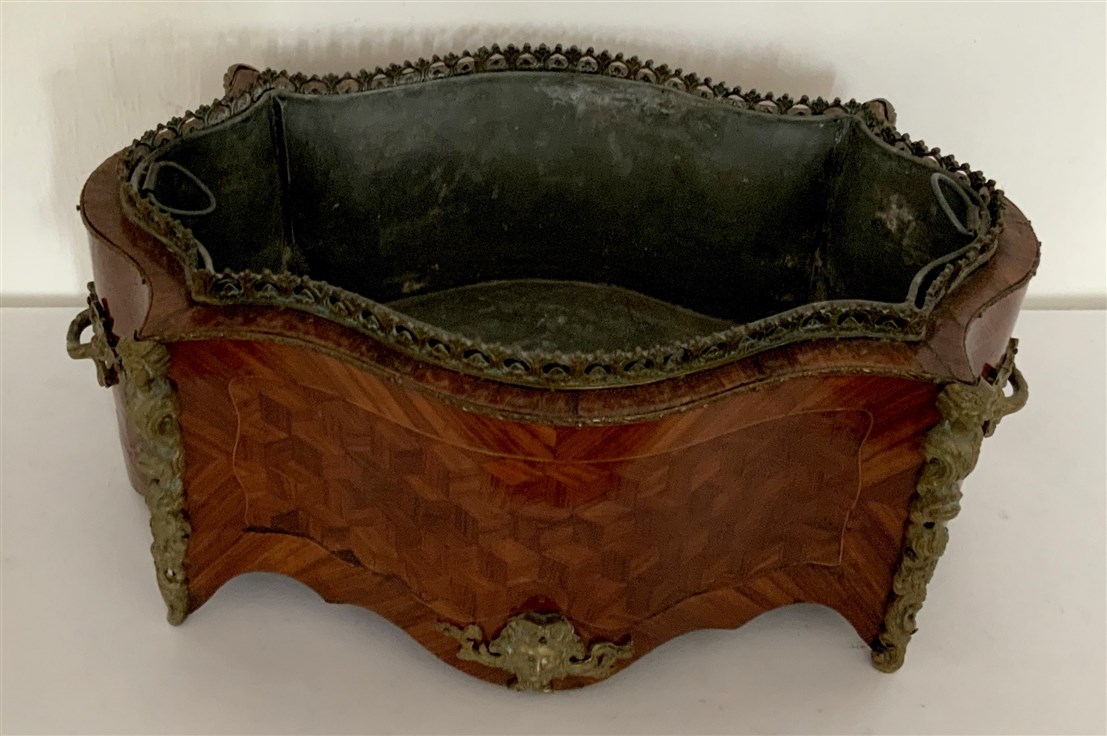 Fioriera lastronata in legni vari a motivi geometrici con anse e fregi in bronzo. Francia, secolo XIX (cm 40x20x26) (restauri, difetti e mancanze)