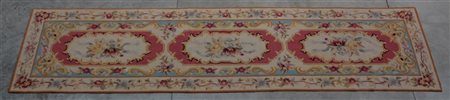 Tappeto piccolo punto in stile Aubusson in lana di moderna manifattura, decorato con tre medaglioni floreali su fondo rosa inseriti in un campo azzurro cielo (cm 297x73) (difetti e macchie)