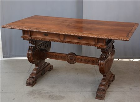 Scrittoio rettangolare in legno intagliato di gusto neorinascimentale con due cassetti nella fascia e sostegni riuniti da traversa (cm 150x79x80) (difetti)