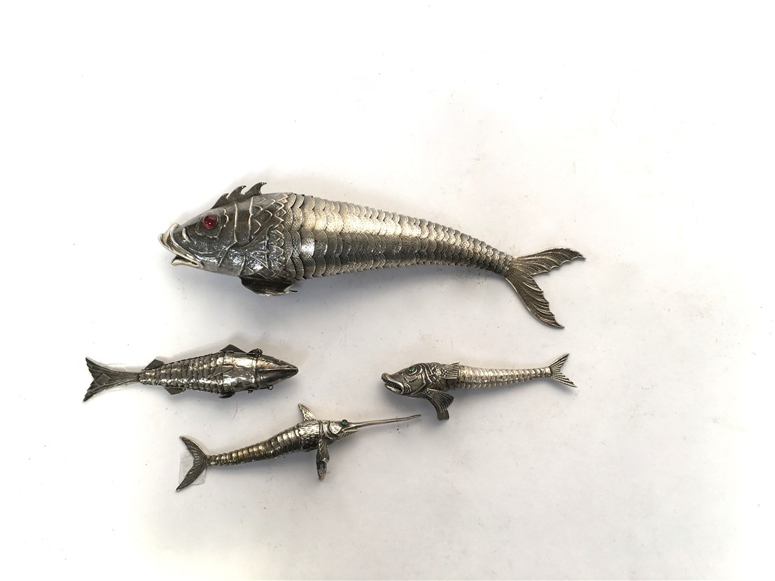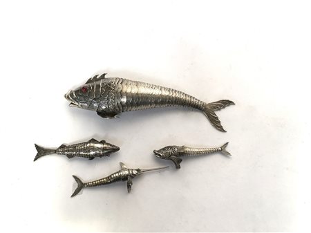 Gruppo di quattro pesci snodabili in argento e metallo argentato (gr. 300) (dif