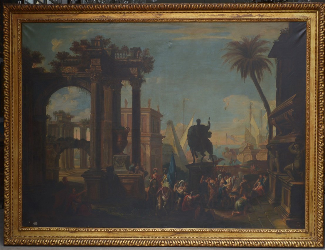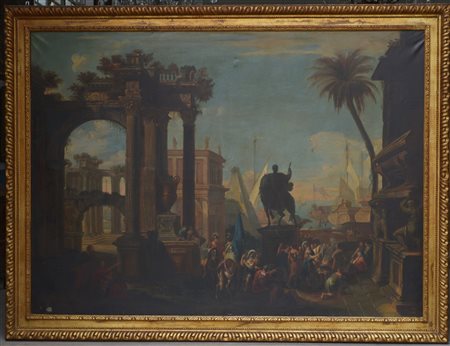 Ignoto della fine del secolo XIX - inizio XX "Paesaggio architettonico con scena di sacrificio" Olio su tela (cm 175x240,5) In cornice (difetti e restauri)