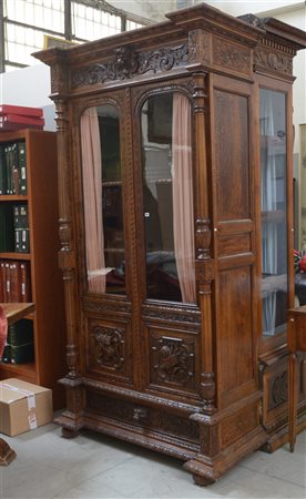 Libreria di gusto neorinascimentale in legno intagliato con ante a vetri, colonnine laterali e cassetto nella fascia inferiore (cm 118x220x51) (difetti)