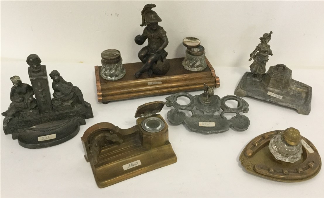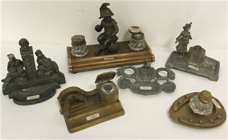 Gruppo di sei calamai decorati con figure e animali di fatture e materiali diff