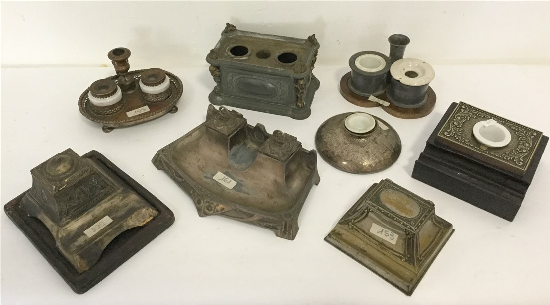 Gruppo di otto calamai di fatture, epoche e materiali differenti (difetti e man