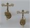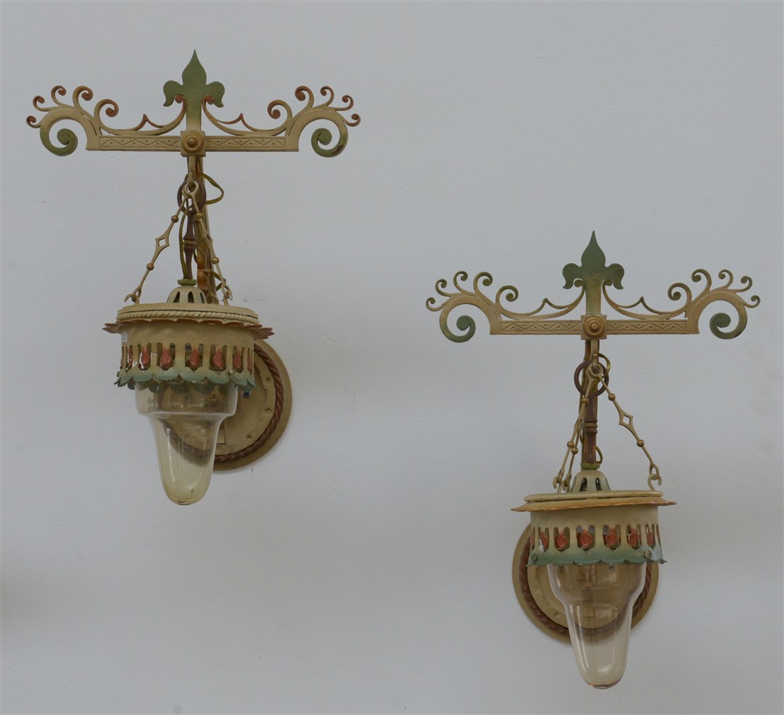 Coppia di lanterne da parete a una luce in ferro battuto, sagomato e dipinto (h cm 48) (lievi difetti)