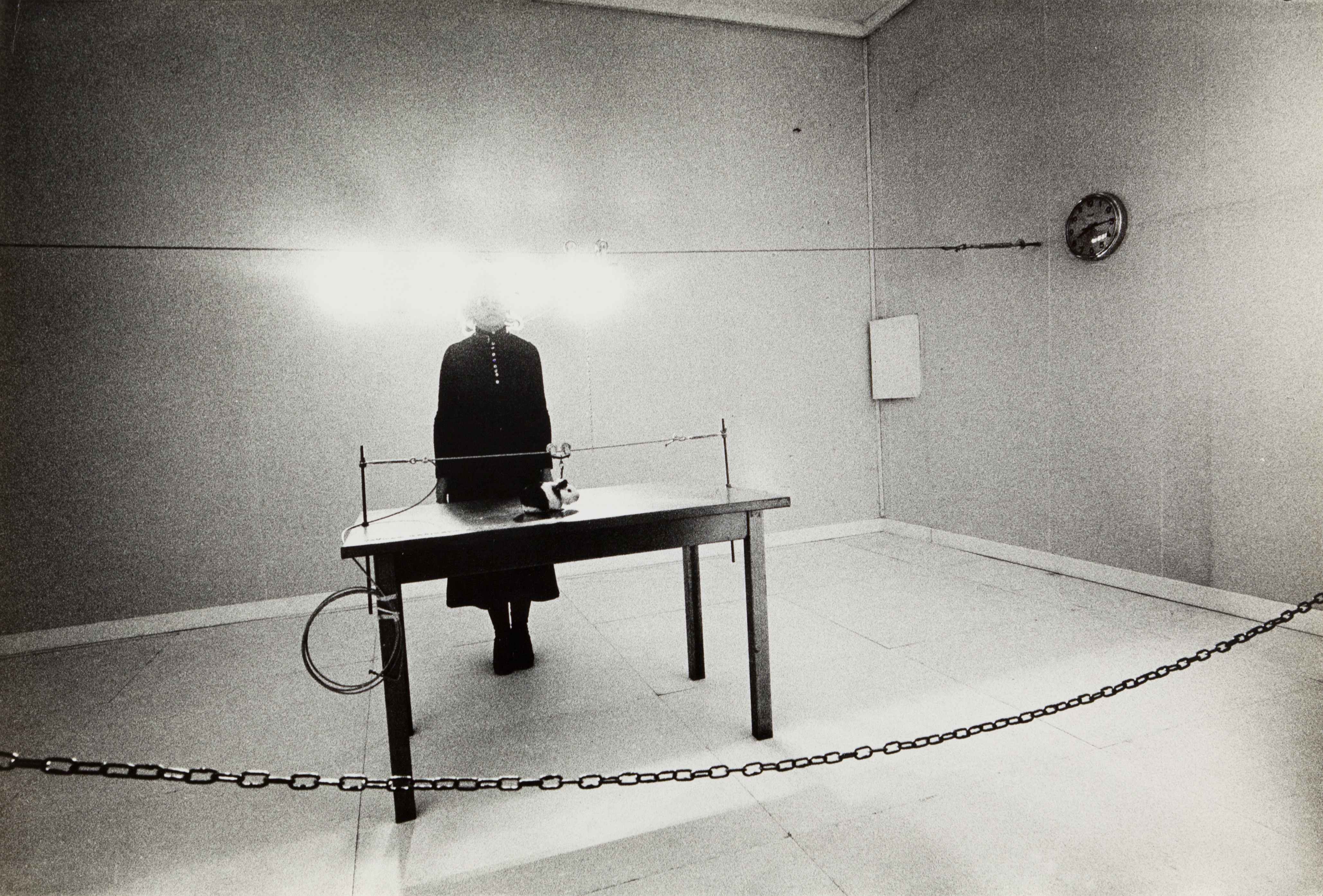 CLAUDIO ABATE Vettor Pisani - tavolo caricato a morte 1970 stampa alla gelatina sali d'argento - vintage 25,5x37,8 cm timbro del fotografo sul retro immagine scattata in occasione della mostra " Vitalità del negativo" nell'arte italiana 1960-70 Palazzo delle Esposizioni - Roma