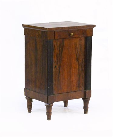 Comodino lastronato in noce ad un'anta con cassetto, montanti ebanizzati a mezza colonna scanalata, piedi torniti. Secolo XIX (cm 50x80x41) (difetti)