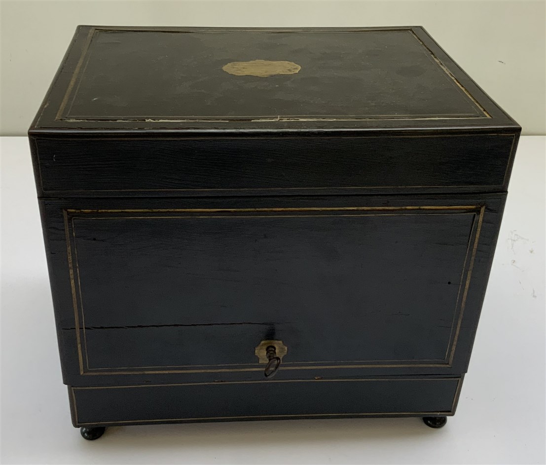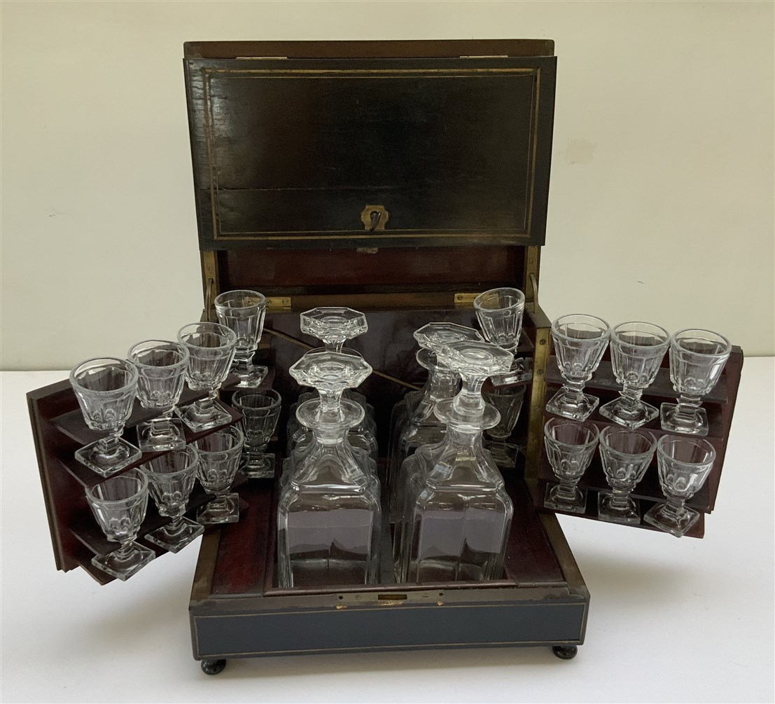 Tantalus con cassa in legno ebanizzato e filettato in ottone contenente quattro bottiglie e sedici bicchierini in vetro. Fine secolo XIX (difetti e mancanze)
