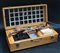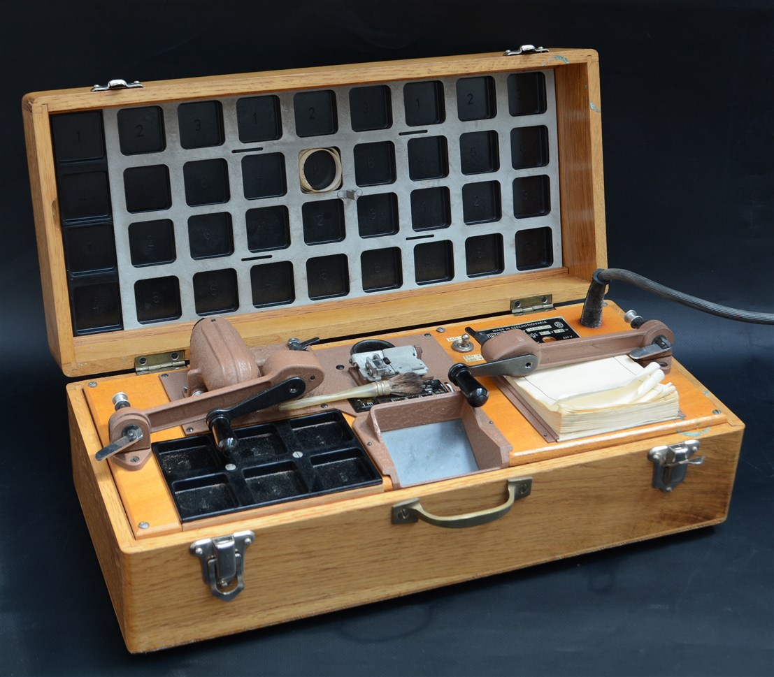 Moviola portatile di con cassa in legno, produzione cecoslovacca (cm 43x15x20)