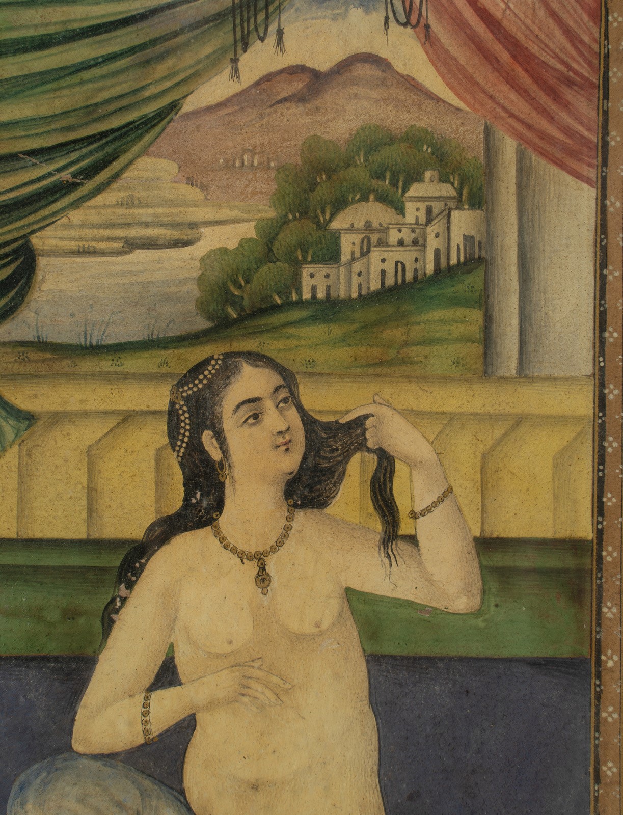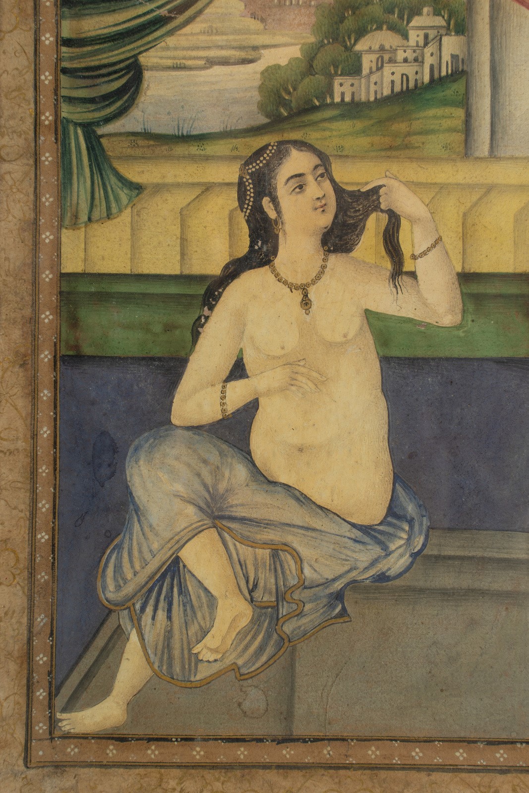 Arte Islamica A painting depicting a woman bathing with an earlier, Persian, illuminated borderIndia, 19th century .