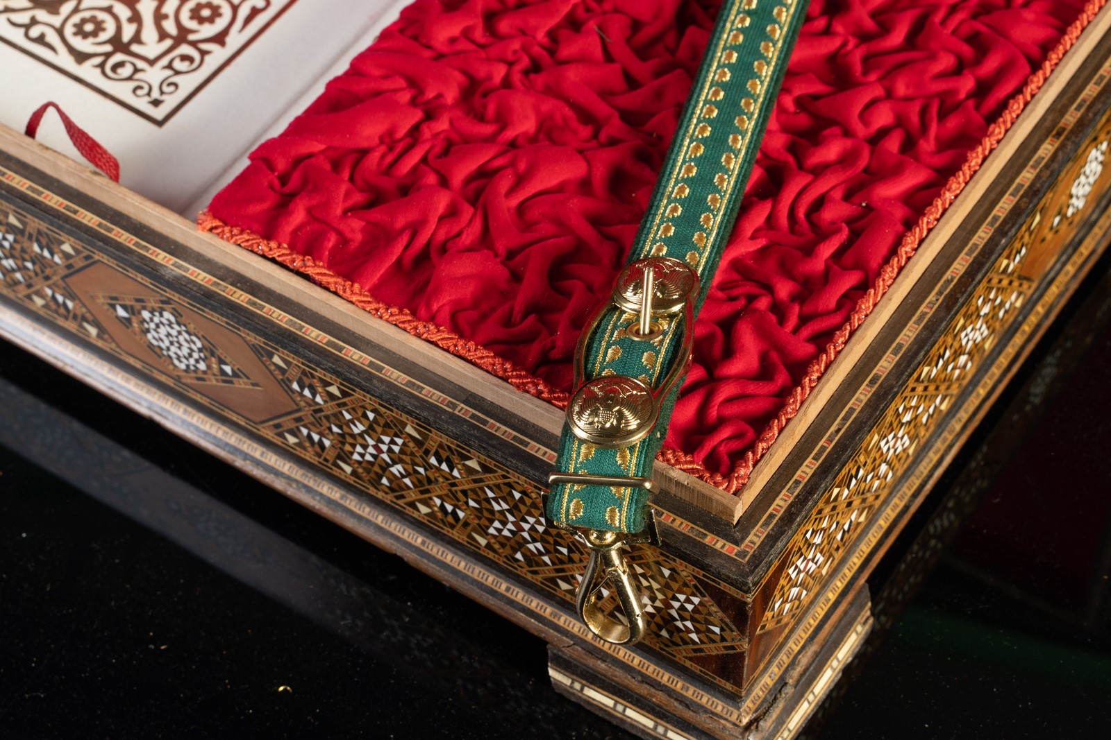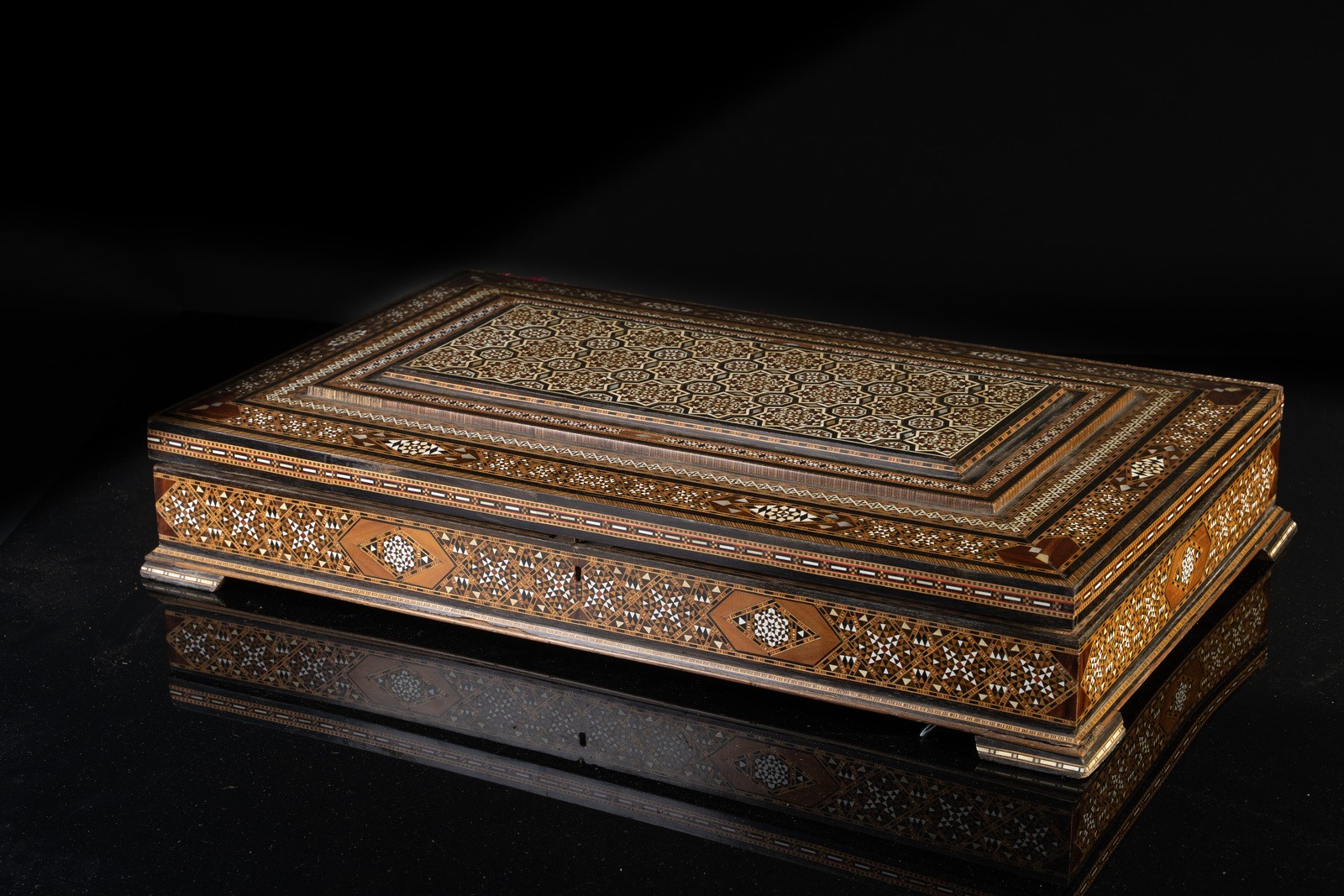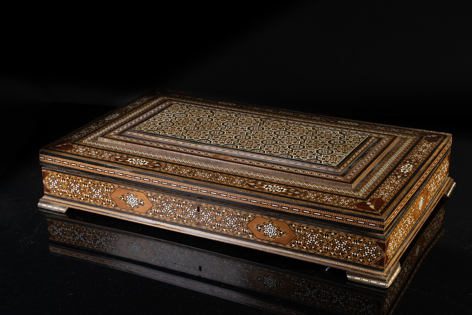 Islamic Art A large mother of pearl inlaid Quran holder box with printed Quran insideNear East, 20th century . . Cm 65,00 x 12,00 x 41,00.