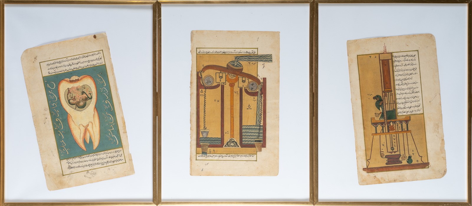 Islamic Art A group of three modern paintings in the style of Al-Jazari automata and scientific subject Iran, 20th century . . . . Frame present