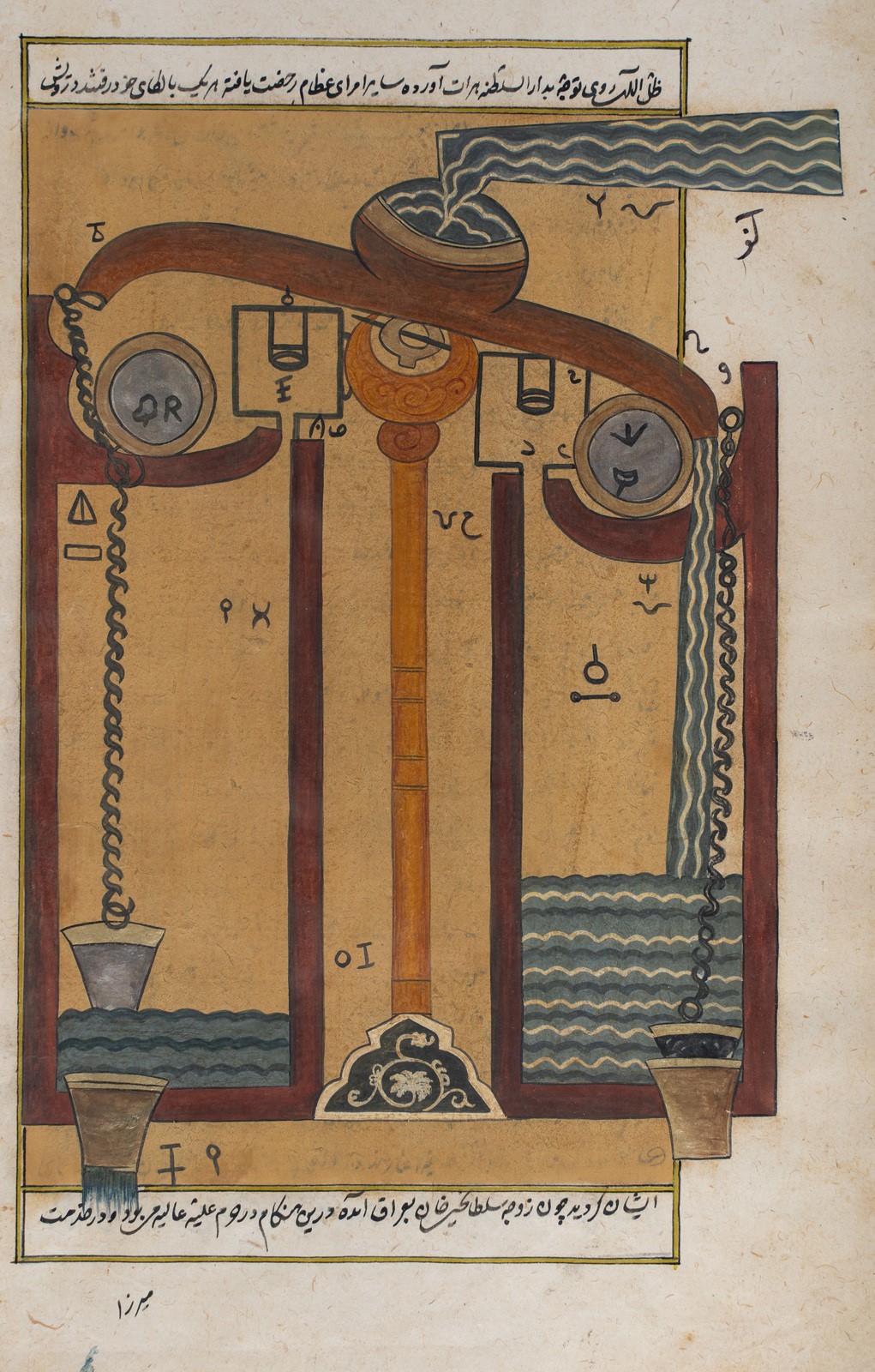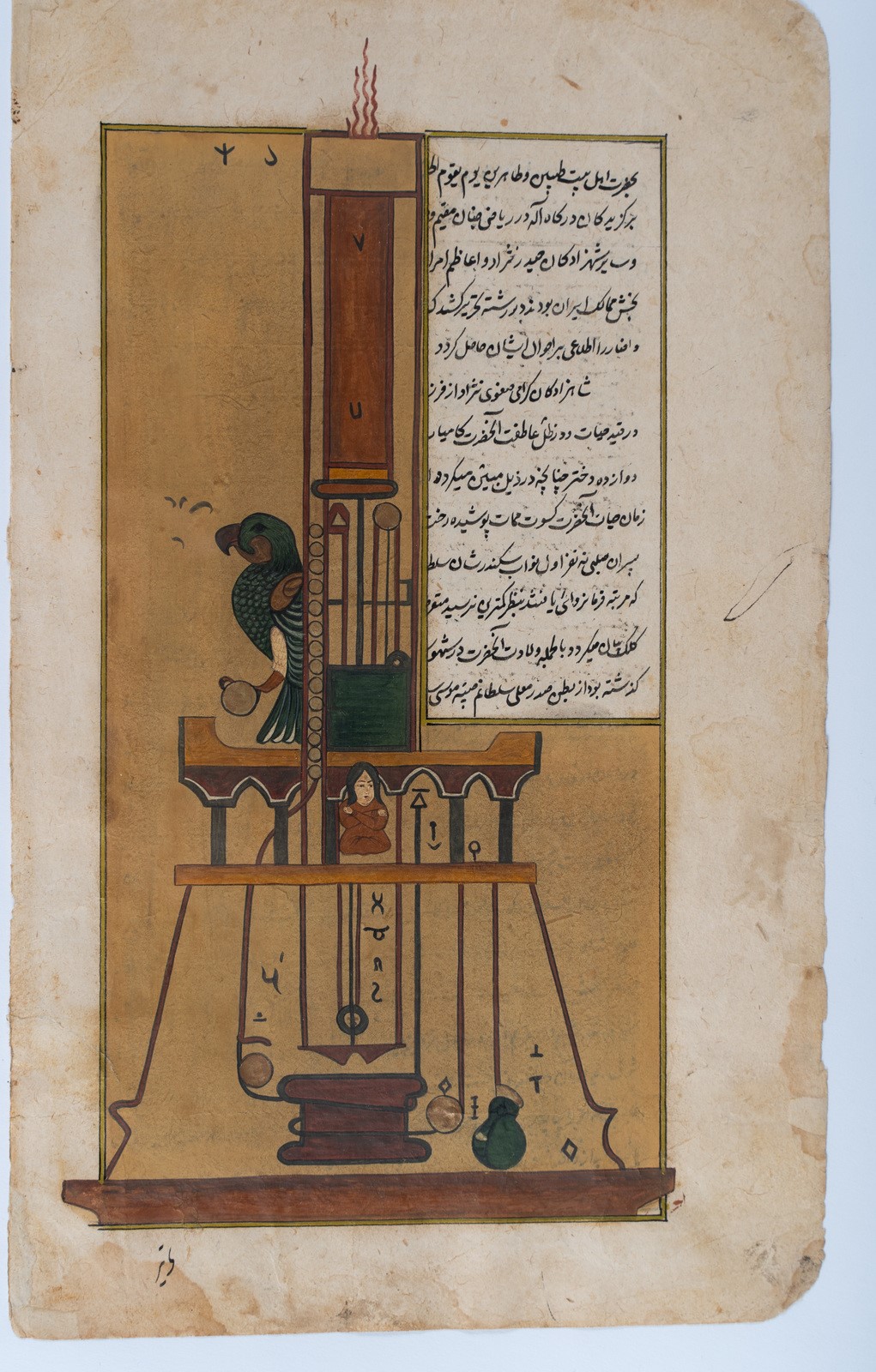 Arte Islamica A group of three modern paintings in the style of Al-Jazari automata and scientific subject Iran, 20th century .