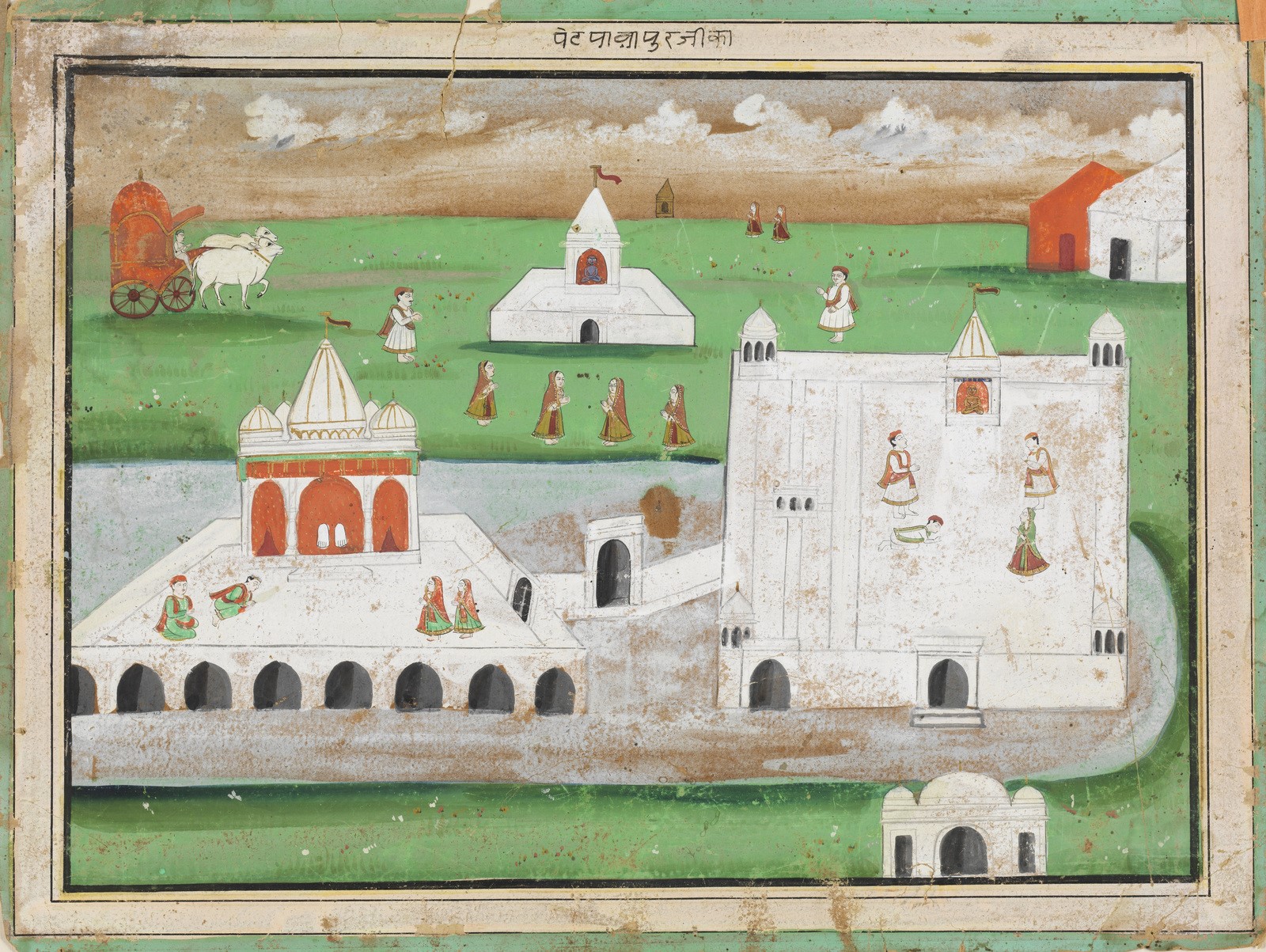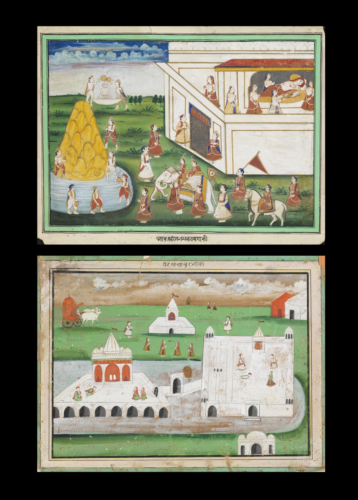 Arte Indiana A pair of paintings within green frame depicting jaina worshipIndia, 19th century .