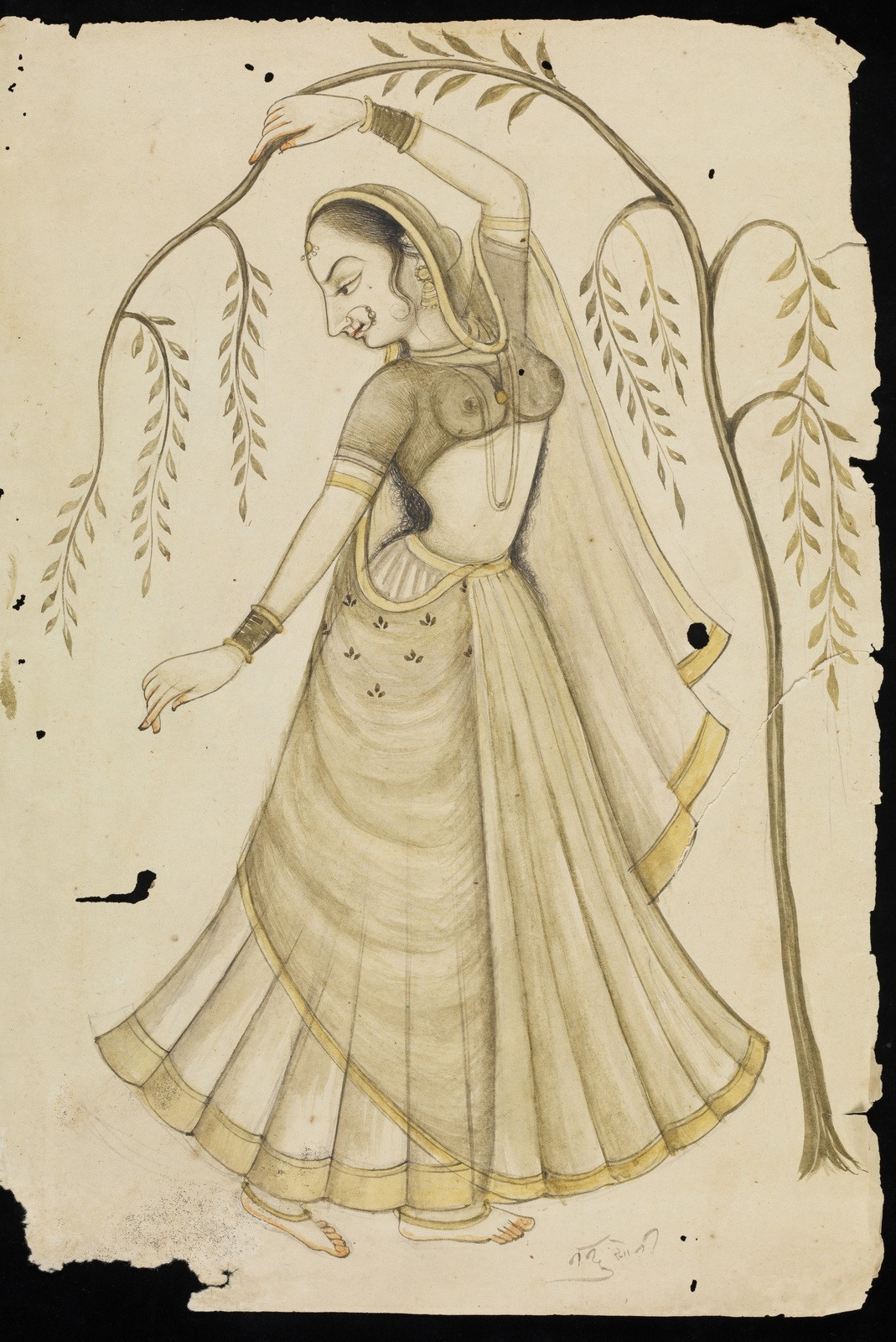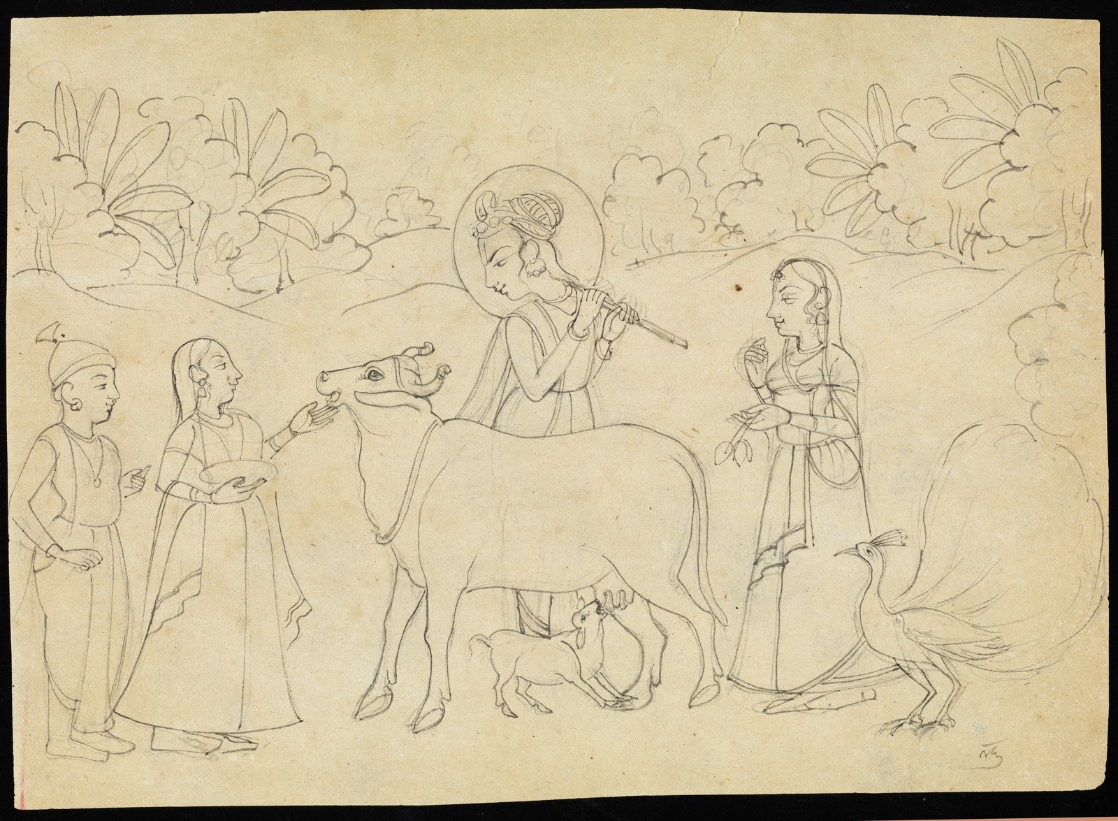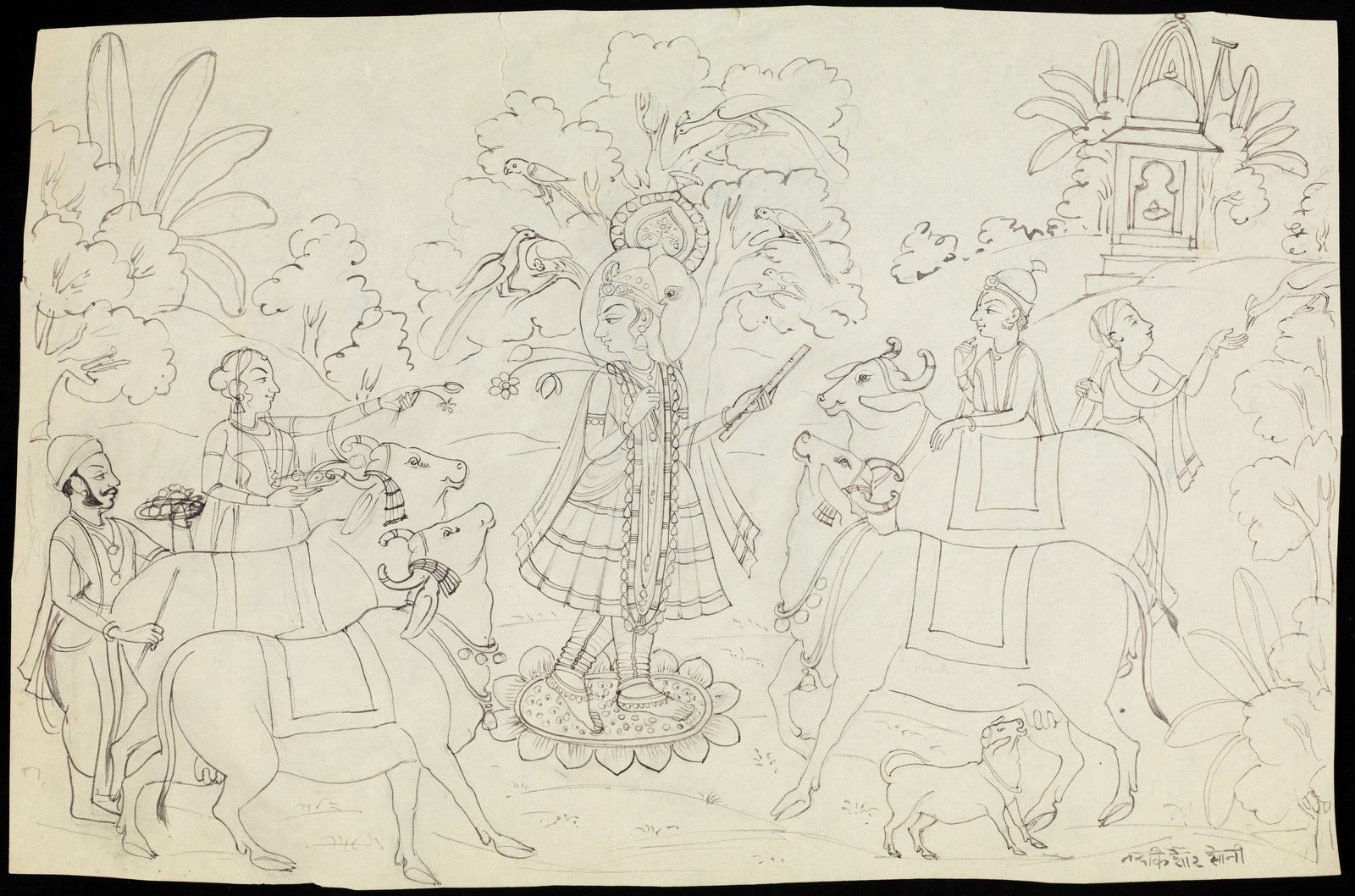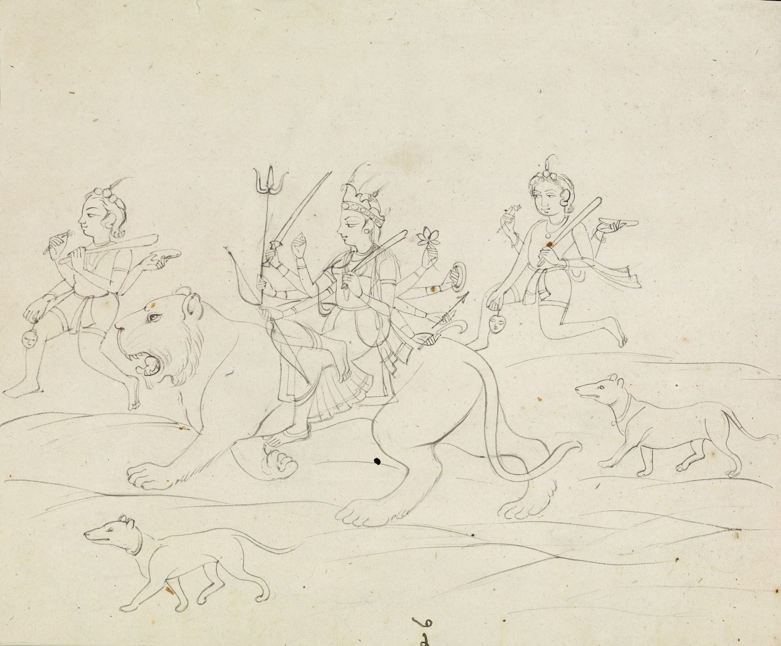 Indian Art A collection of eight Indian drawings India, 19th-20th century . . Cm 23,50 x 33,50. Including: two depictions of Lord Krishna playing the flute; Durga on a lion; two female portraits in the Kishengarh style (whose one signed); a Bhairavi Ragini ragamala (partially coloured); a Mughal style male portrait (signed) and a woman dancing under a tree (signed). Provenance: Venetian private collection, Italy.