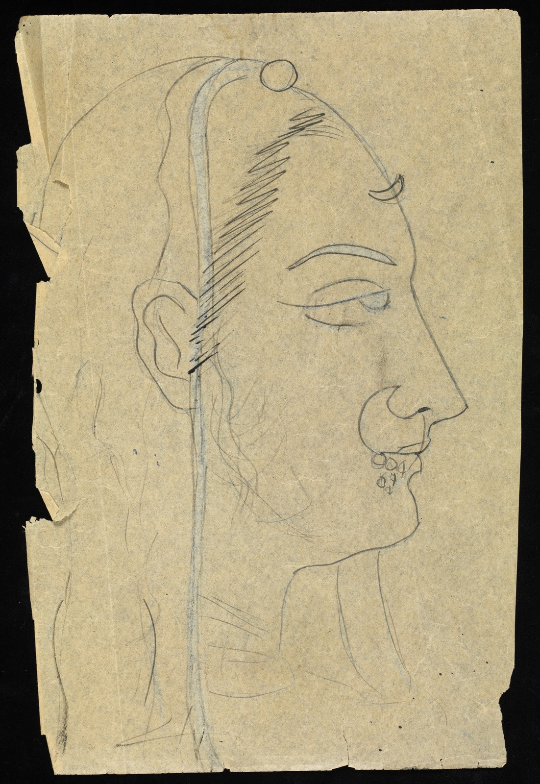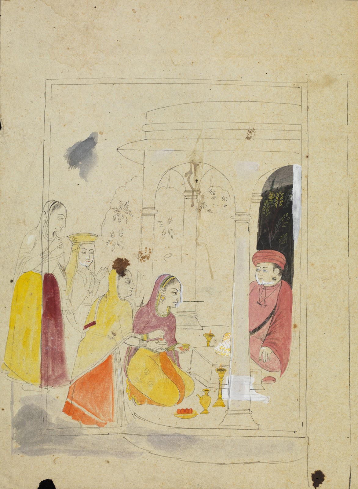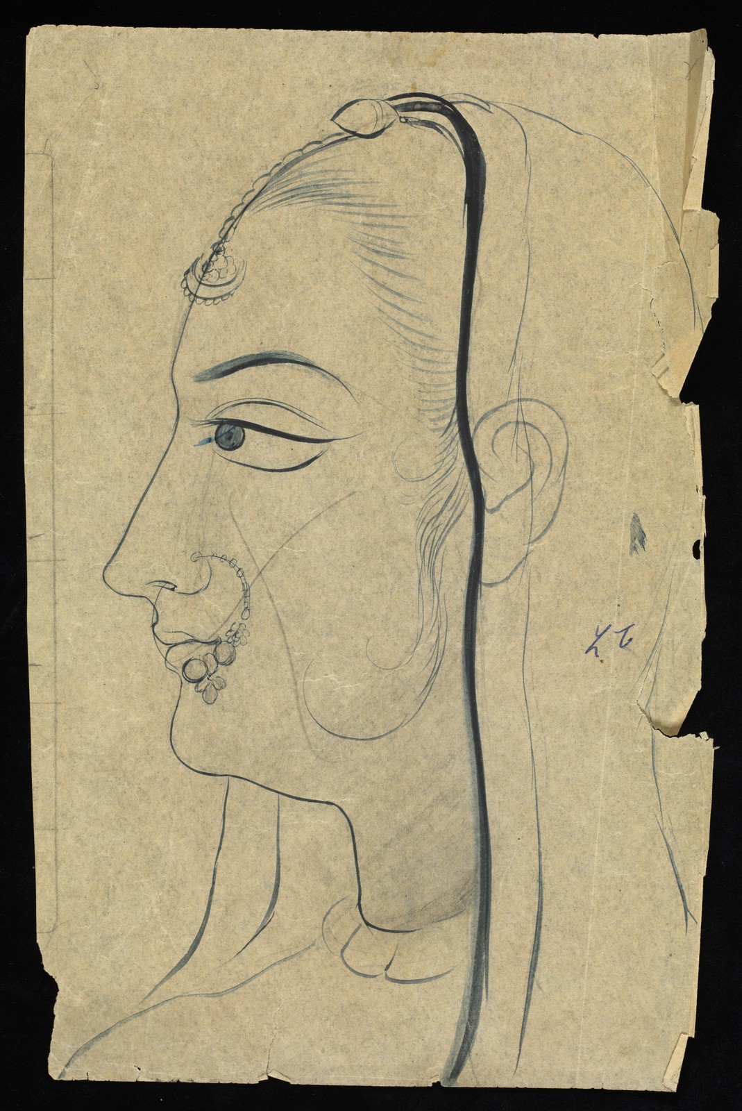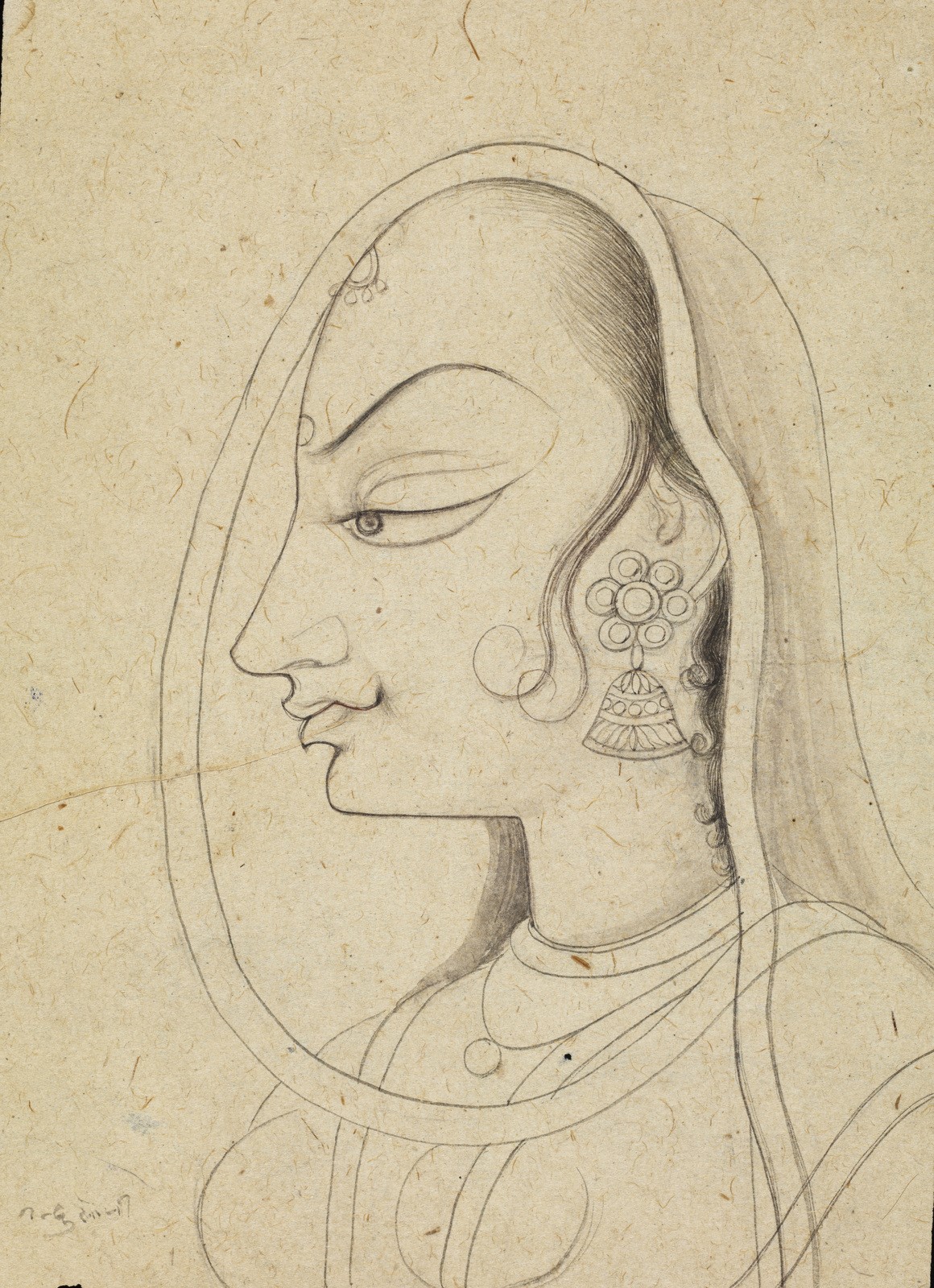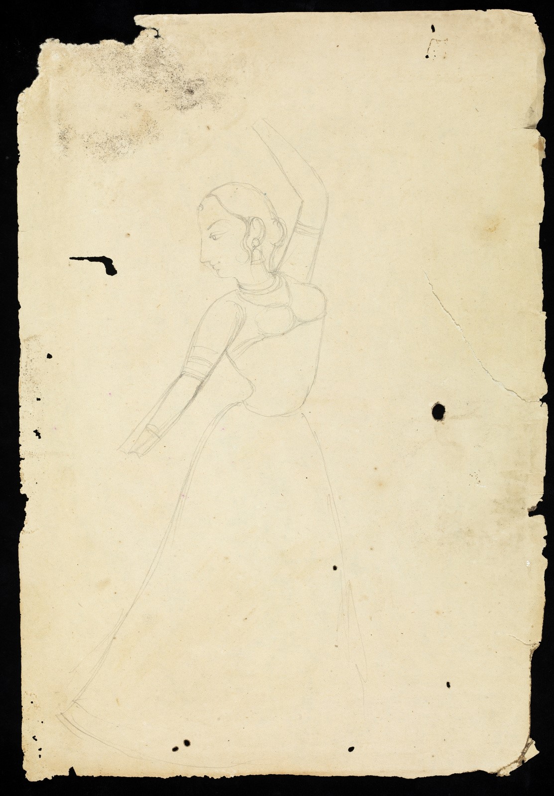 Indian Art A collection of eight Indian drawings India, 19th-20th century . . Cm 23,50 x 33,50. Including: two depictions of Lord Krishna playing the flute; Durga on a lion; two female portraits in the Kishengarh style (whose one signed); a Bhairavi Ragini ragamala (partially coloured); a Mughal style male portrait (signed) and a woman dancing under a tree (signed). Provenance: Venetian private collection, Italy.
