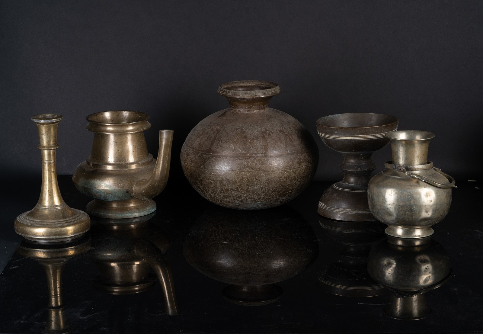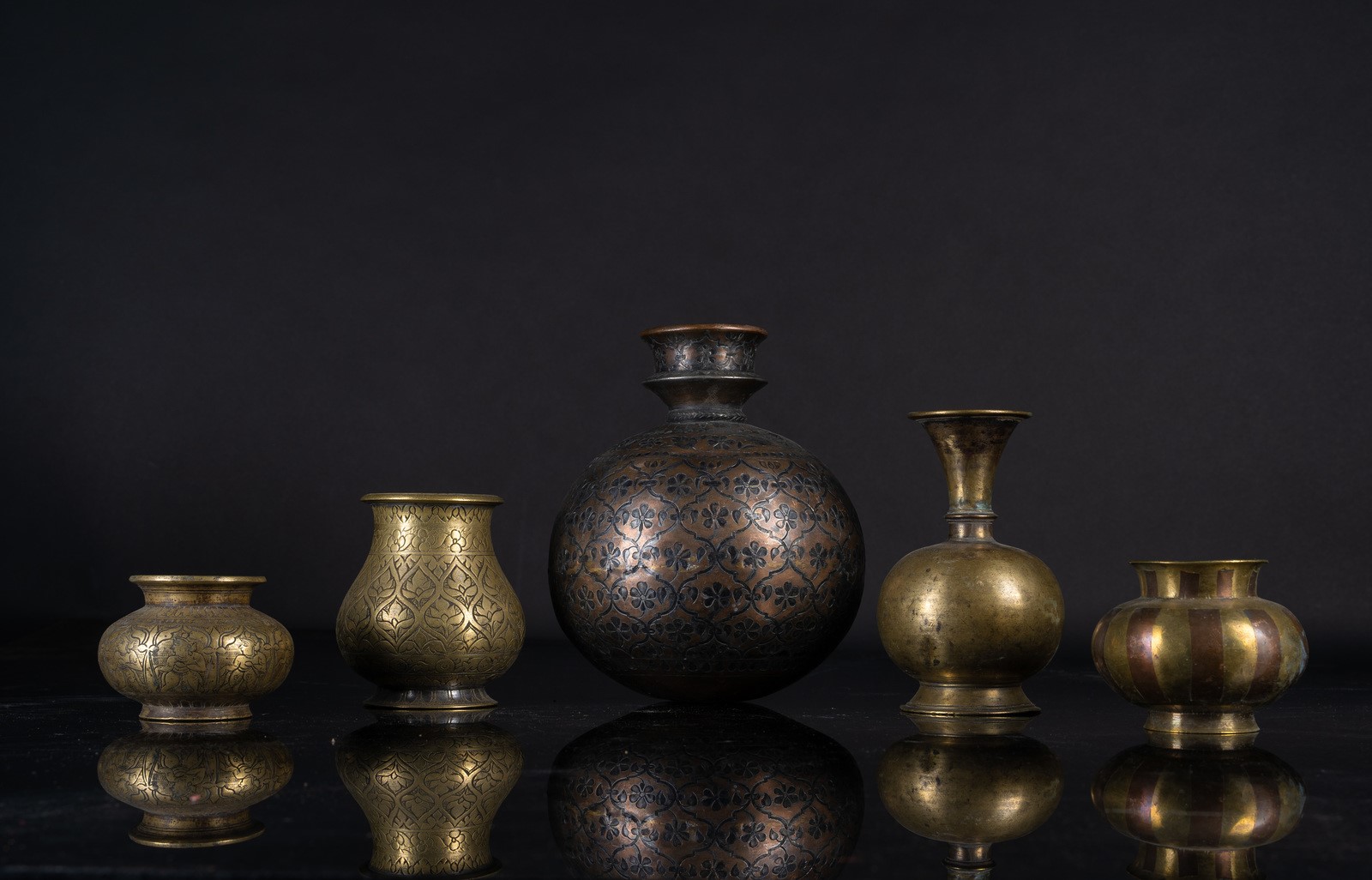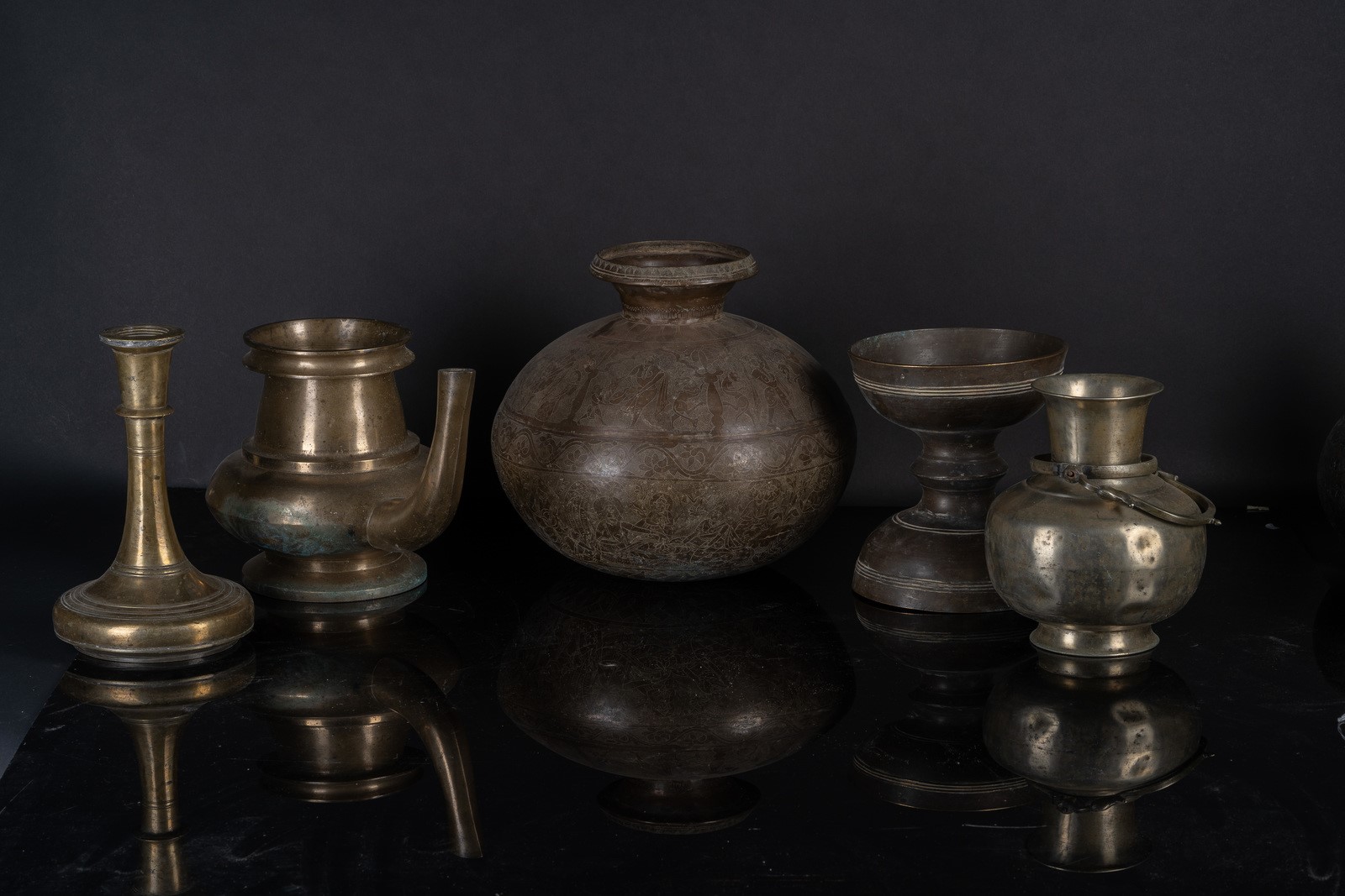 Lot 391 | Arte Indiana A collection of ten metal lotas, vases and huqqa basesIndia, 19th century .
