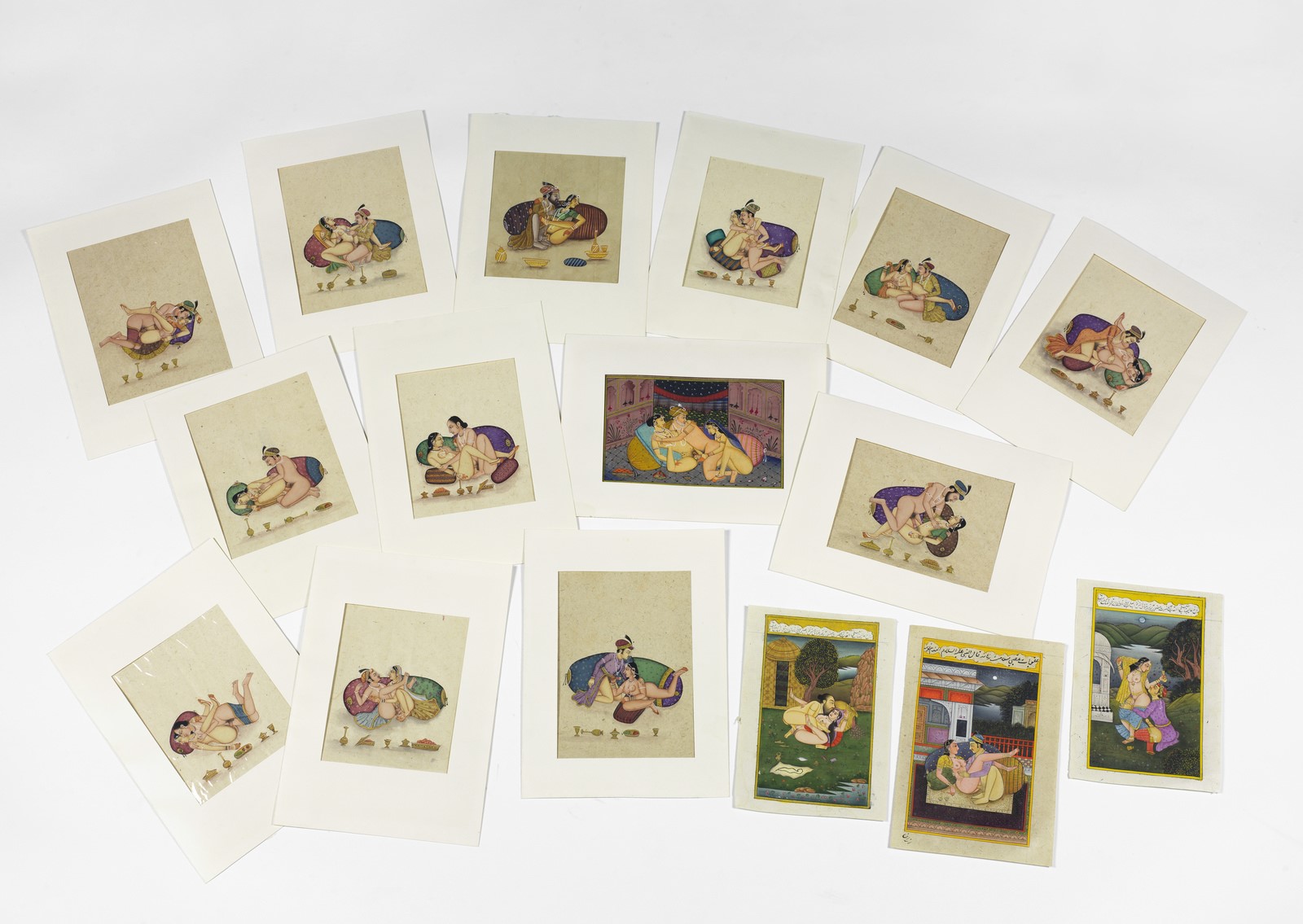 Arte Indiana A collection of sixteen erotic miniature paintings India, 20th century .