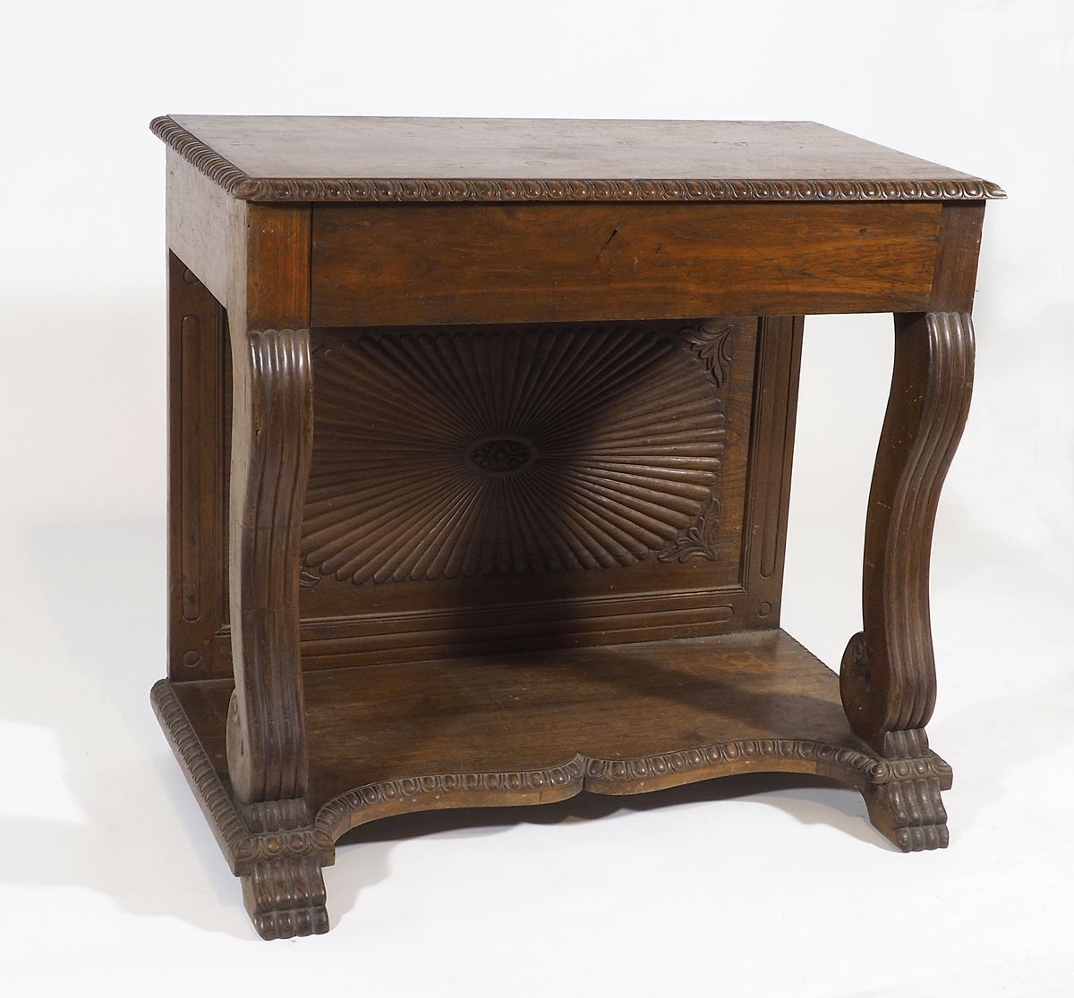 Consolle in legno con cassetto su gambe ferine anteriori. cm. 83x92x57.