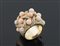 Anello a fascia in oro giallo con coralli rosa cabochon alternati da fascette intrecciate ricperta da diamantini. Misura 17