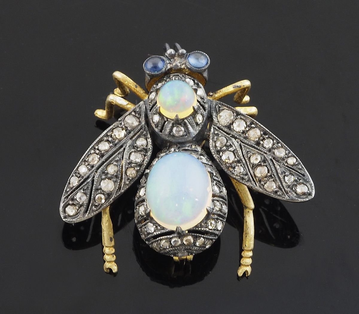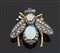 Spilla in oro giallo e argento a forma di mosca con diamantini e opale nella tonalità dell'azzurro, cm 3