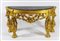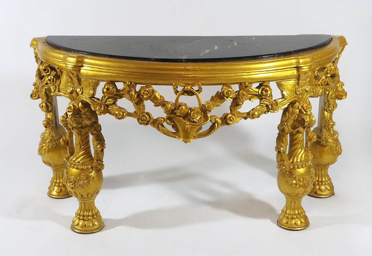 Consolle a mezzaluna in legno dorato riccamente scolpito con piano in marmo nero. cm. 74x137x60.