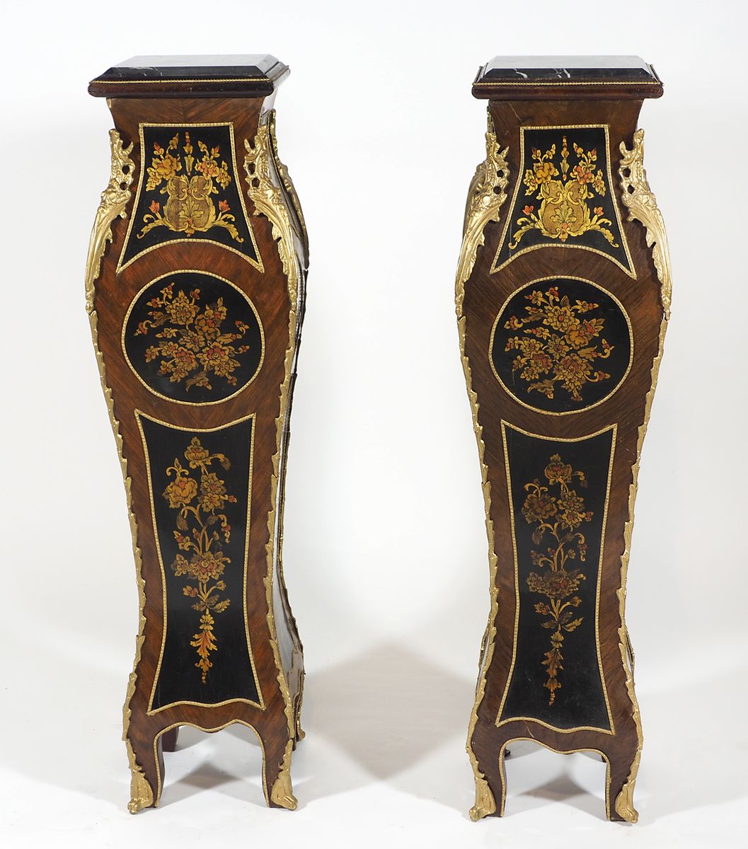 Coppia di colonne in legno decorate con medaglioni a motivi floreali e applicazioni di fregi in bronzo dorato, piano in marmo nero. H. cm. 110.