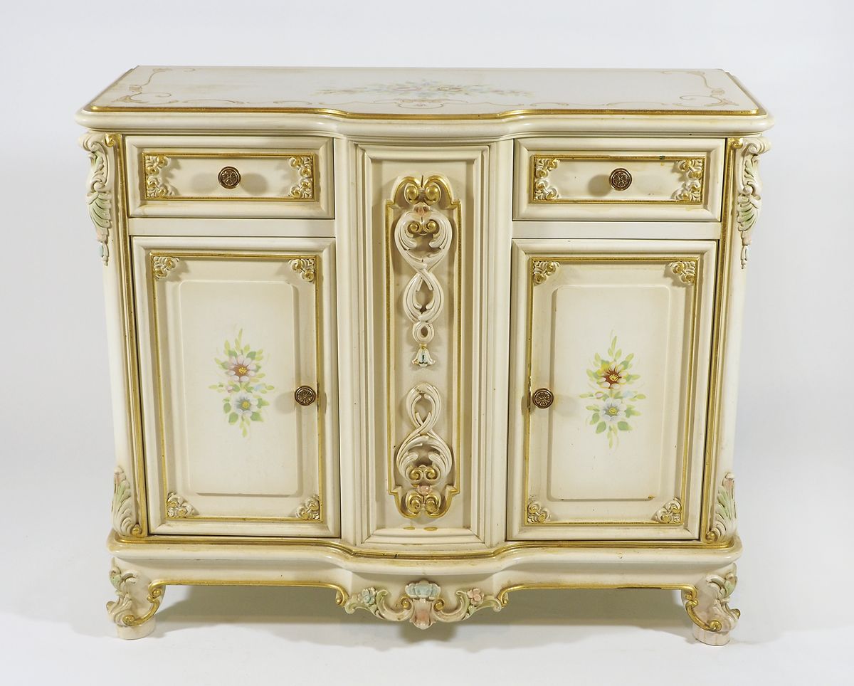 Credenza a 2 ante 2 cassetti laccata bianca con pitture policrome a motivi floreali. cm. 88x103x44.