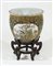 Grande cachepot in porcellana policroma decorato a motivi orientali, base in legno. H. tot cm. 60.