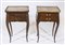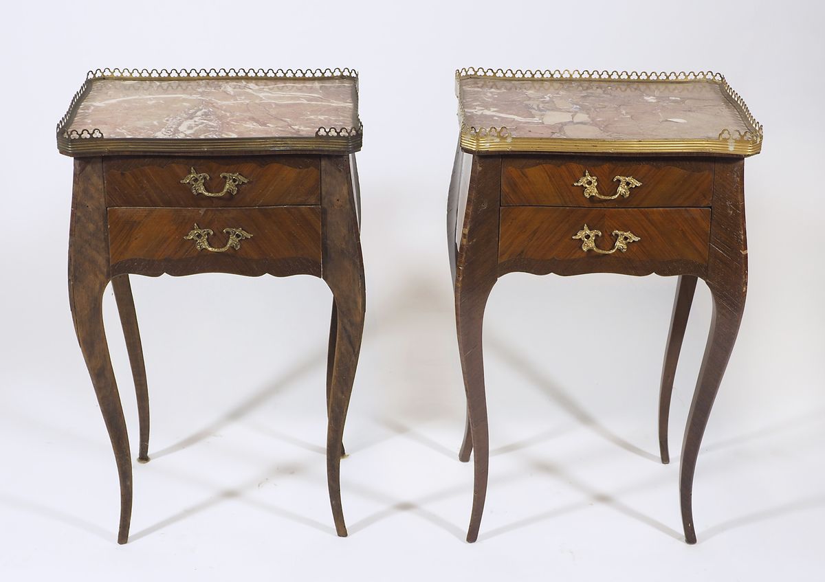 Coppia di comodini a 2 cassetti su alte gambe a scabola, piano in marmo. (rottura).