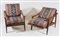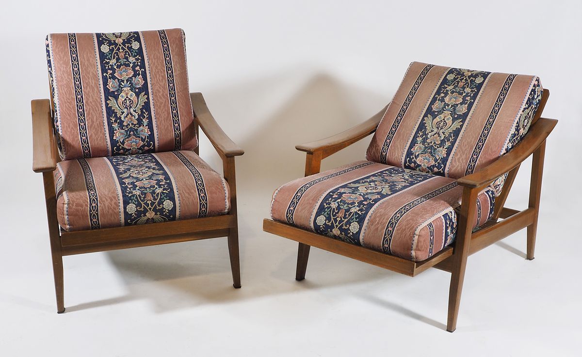 Coppia poltrone in legno con schienale e seduta mobili, con cuscini floreali. Anni '60.