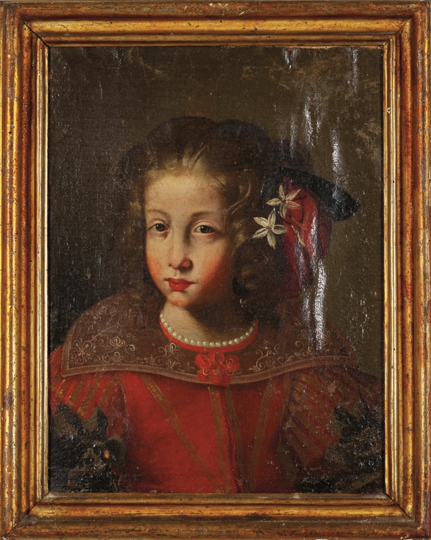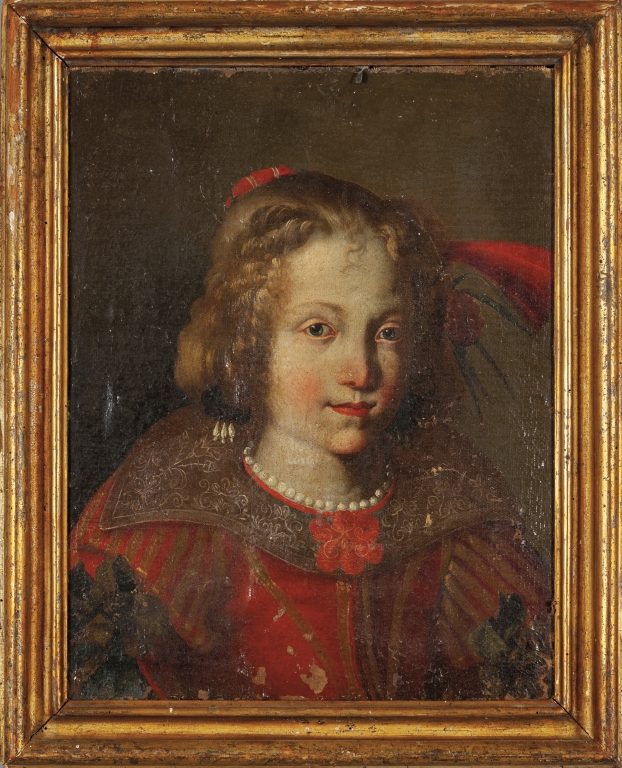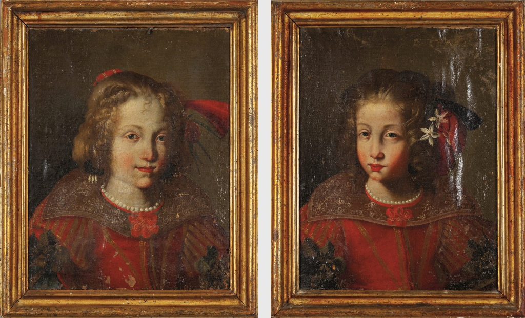 Scuola genovese sec.XVII 'Ritratti di fanciulle' coppia di olii cornici coeve in legno intagliato e dorato