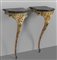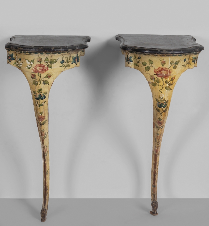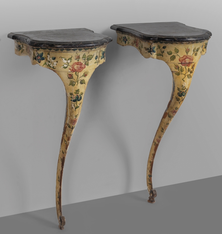 Coppia di consoline dipinte a fiori in policromia su fondo chiaro piano in marmo portoro laccatura coeva Genova I metà sec.XVIII