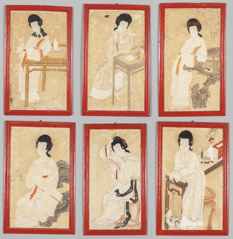 Sei carte cinesi di misure lievemente diverse raffiguranti figure femminili