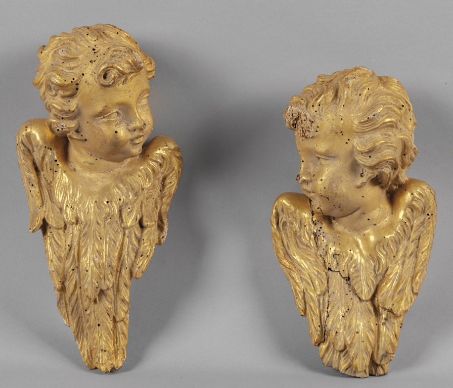 Coppia di testine di angioletti in legno finemente intagliato e dorato Genova sec.XVIII