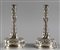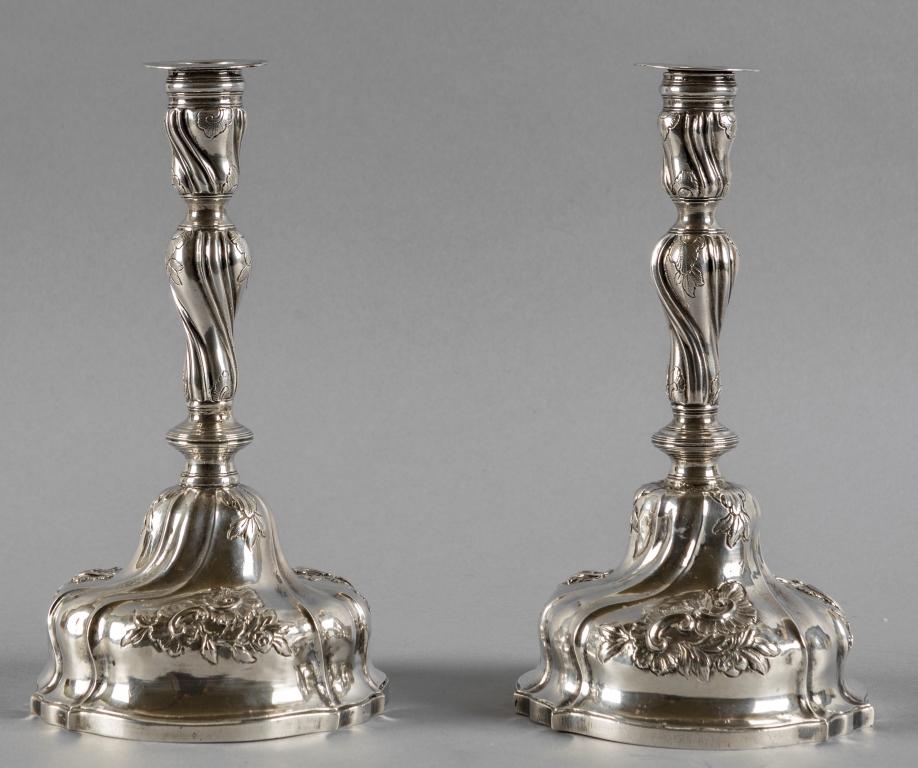 Coppia di candelieri in argento finemente sbalzato con il motivo della pellaccia fusto a tortiglione punzone della Torretta Genova sec.XVIII