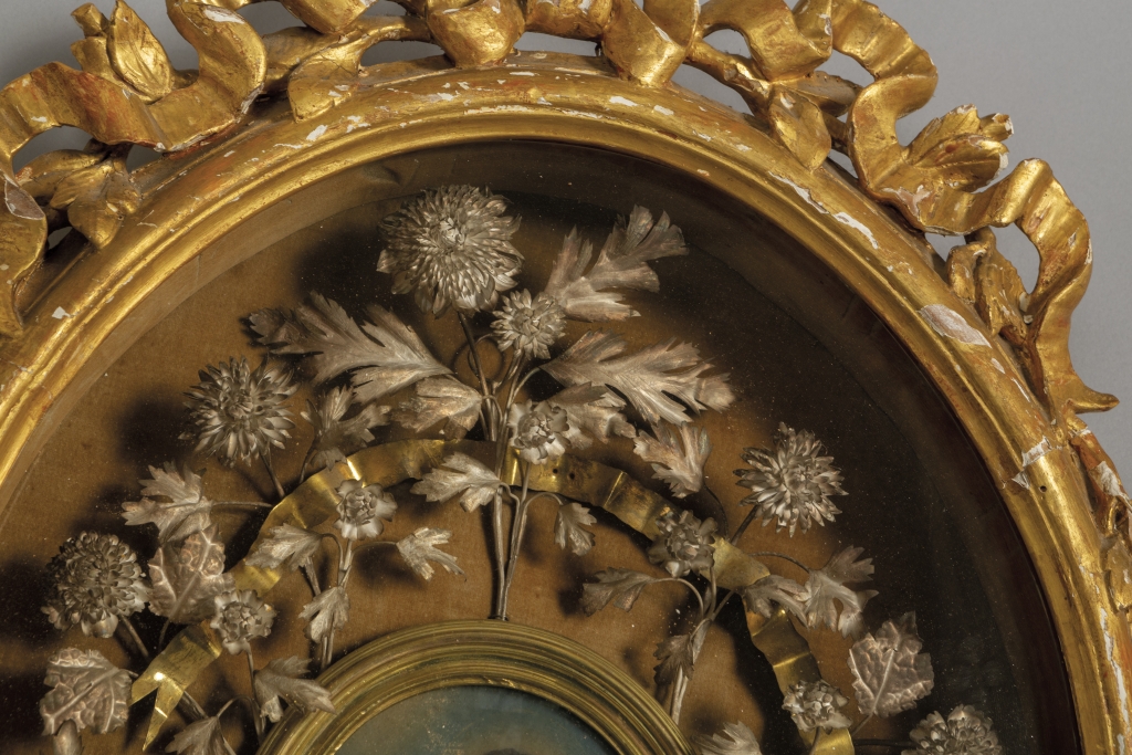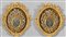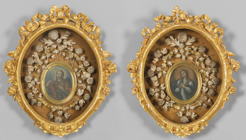 Coppia di teche Luigi XVI in legno intagliato e dorato all'interno olii su rame raffiguranti Madonnina e San Giuseppe cornici in bronzo dorato con fiori in argento Genova II metà sec.XVIII