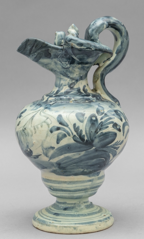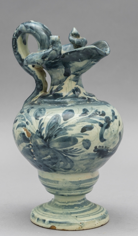 Versatoio in maiolica decorazione bianca e blu con nave e volute vegetali Savona sec.XVII