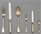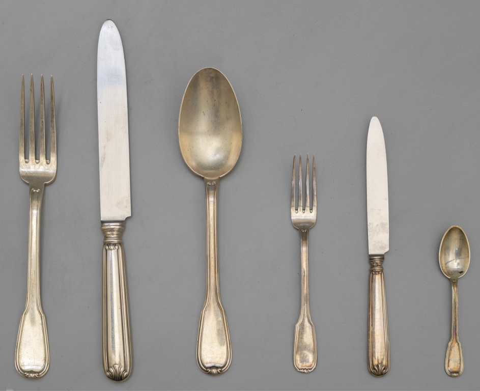 Servizio di posate in argento composto da 12 forchette grandi (gr.900) 6 coltelli grandi 6 cucchiai grandi (gr.400) 16 forchette piccole (gr.450) 18 coltellini da frutta e 6 cucchiaini (gr.80)
